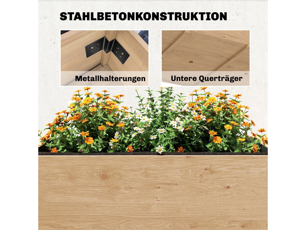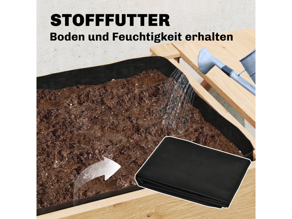 Látková vložka s drenážními otvory: Černé netkané textilní vložky chrání dřevo před vlhkostí. Šest drenážních otvorů zajišťuje optimální odvodnění, což umožňuje vašim rostlinám vyvíjet zdravé kořeny.