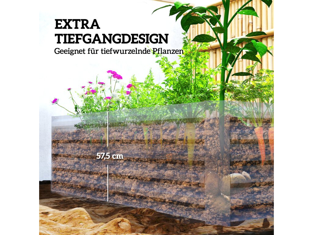 Extra hluboký design: Tento vyvýšený záhon o hloubce 57,5 cm Je ideální pro hluboce zakořeněné rostliny. Hloubka podporuje silné kořeny a umožňuje efektivní příjem živin.