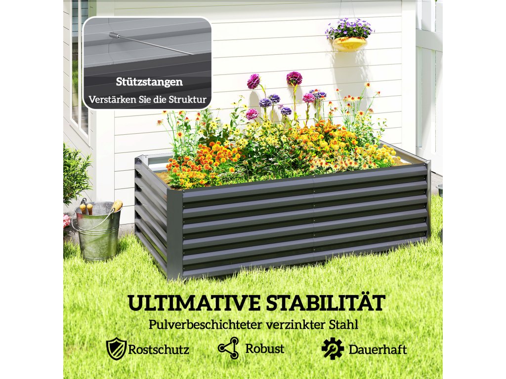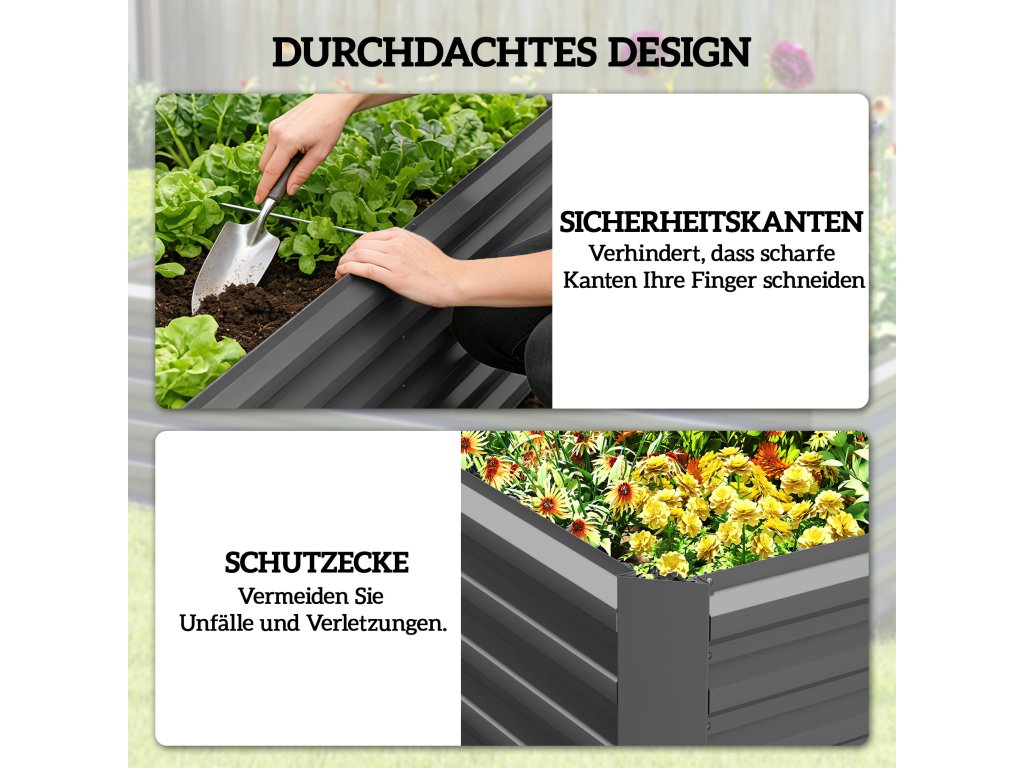 Bezpečná ochrana okrajů: Díky ohnutým okrajům, zaobleným rohům a ochranným krytkám poskytuje tento vyvýšený záhon bezpečnost pro všechny věkové kategorie. Hladké okraje minimalizují riziko zranění při zahradničení.