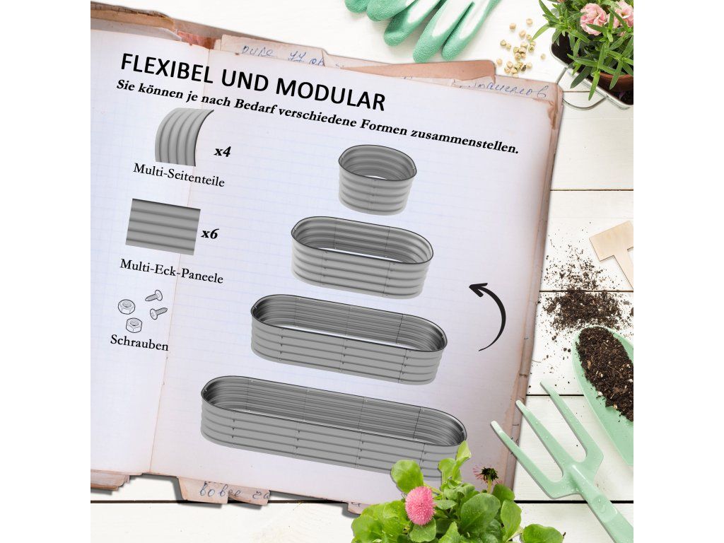 - Modulární konstrukce: Každý záhon se skládá z několika bočních a rohových částí. Ty lze sestavit do různých tvarů podle potřeby nebo pro různé rostliny.
