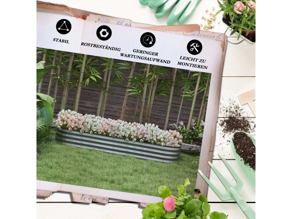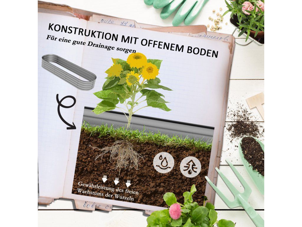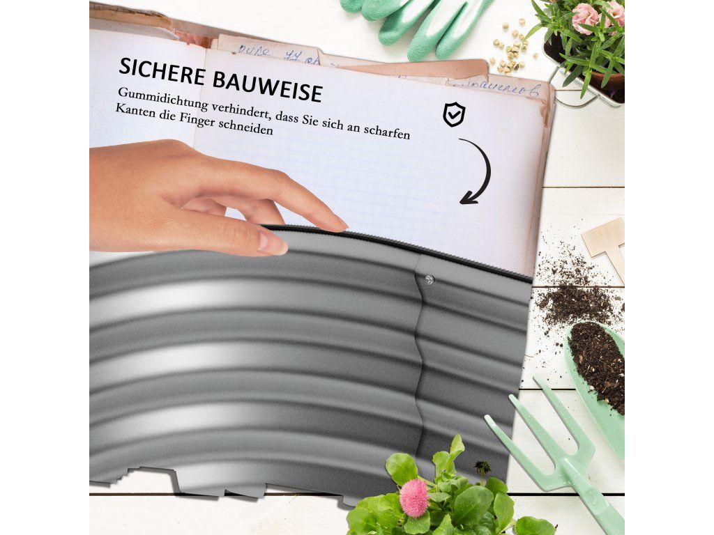 - Chráněné okraje: Horní okraj záhonu je chráněn gumovým okrajem, takže ostré hrany nemohou poranit prsty.