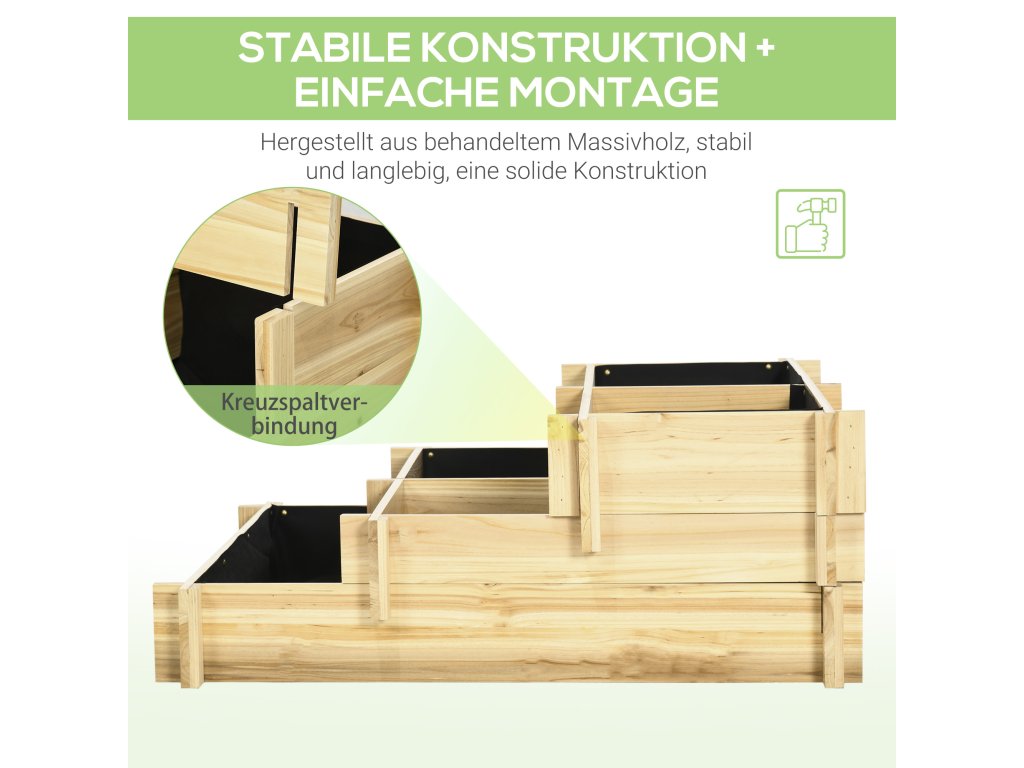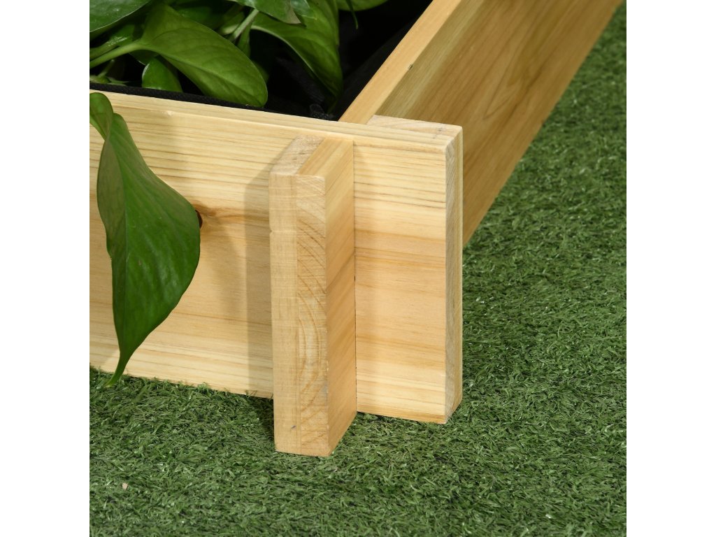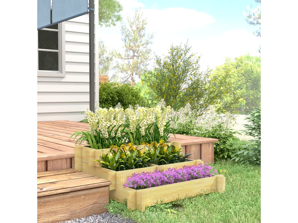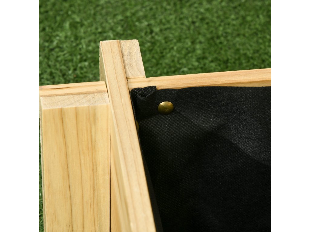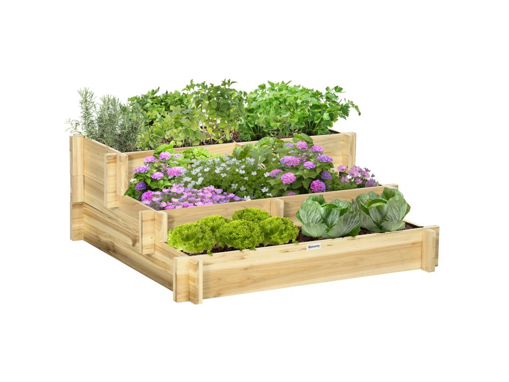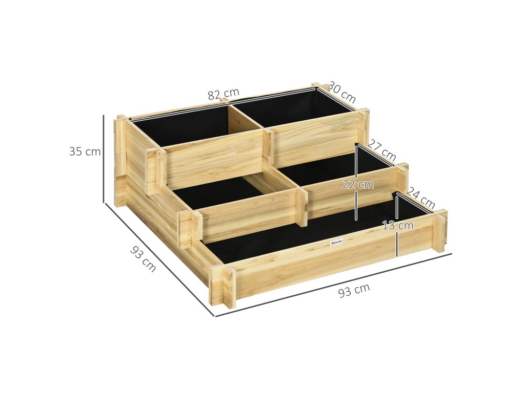 Vyvýšený záhon Outsunny, truhlík na květiny, 3 patra, odtokový otvor, textilní obložení, přírodní dřevo, 93 x 93 x 35 cm