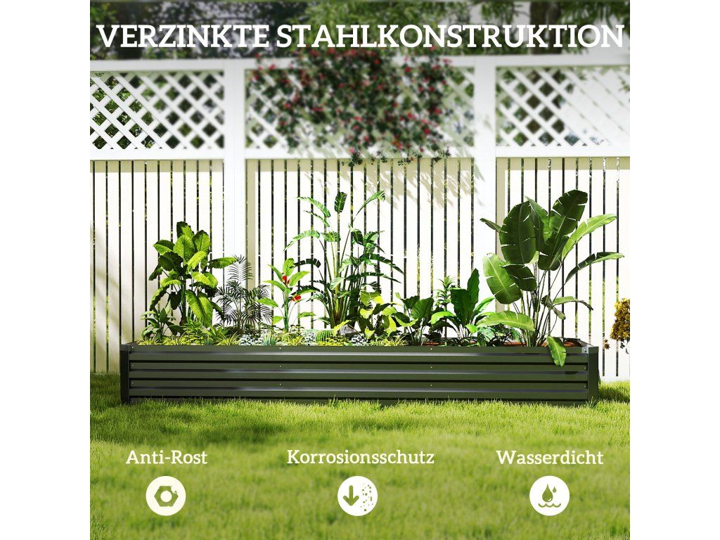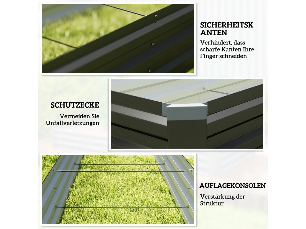 - Robustní konstrukce: Náš vyvýšený zahradní záhon má práškově lakovaný, žárově pozinkovaný ocelový rám a několik vnitřních podpěrných vzpěr pro bezpečný růst rostlin a další prvky