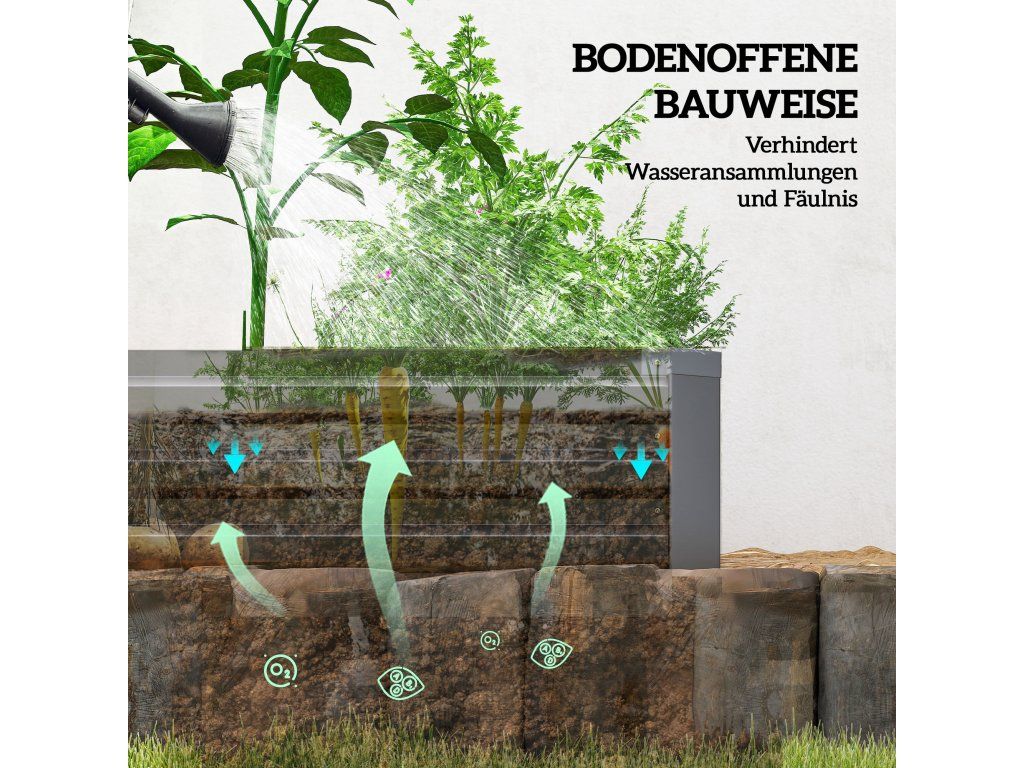 - ✔ Otevřená základna vyvýšeného záhonu pro přímý kontakt s půdou. Žádné hromadění vody v půdě