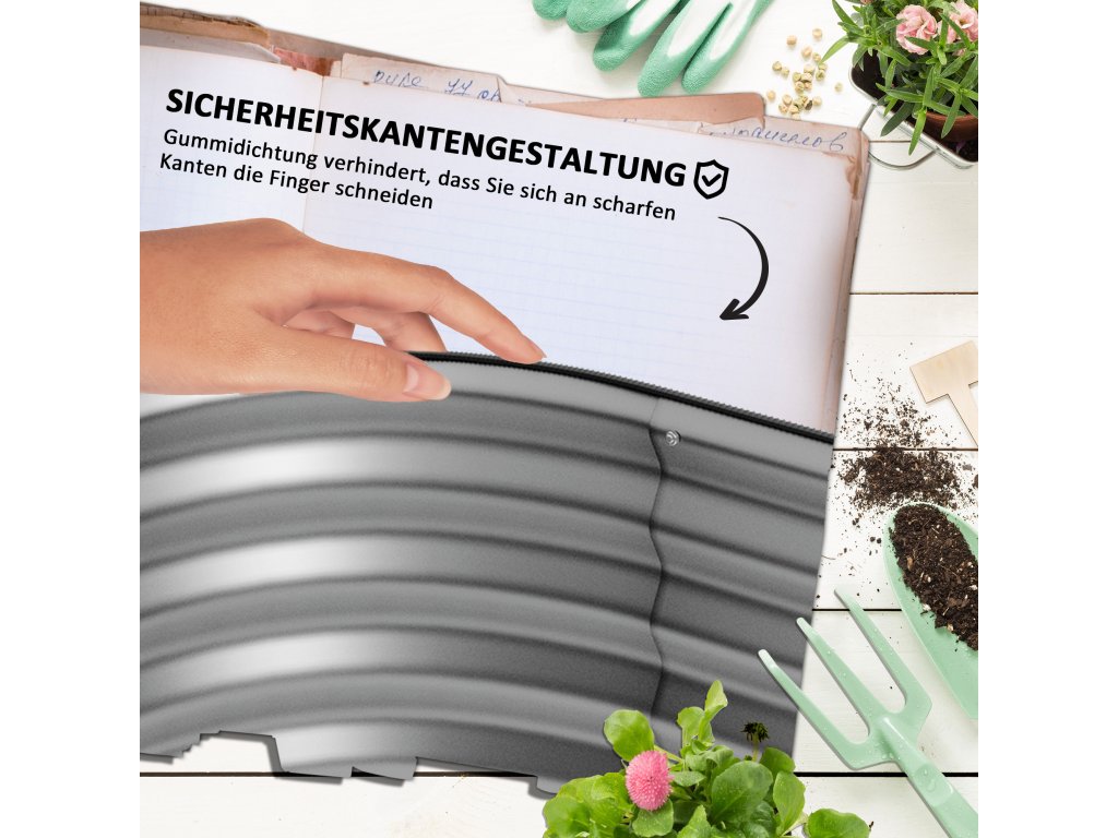 - Chráněné okraje: Horní okraj záhonu je chráněn gumovým okrajem, takže ostré hrany nemohou poranit prsty.