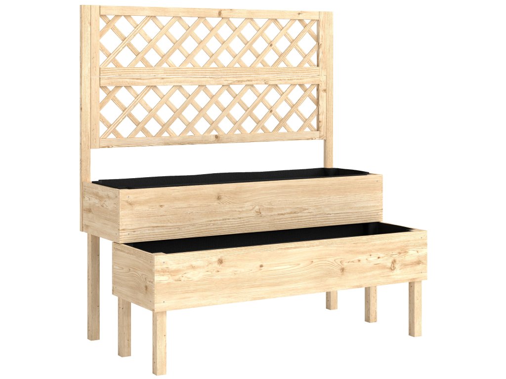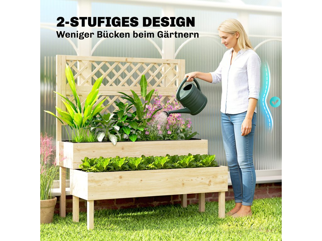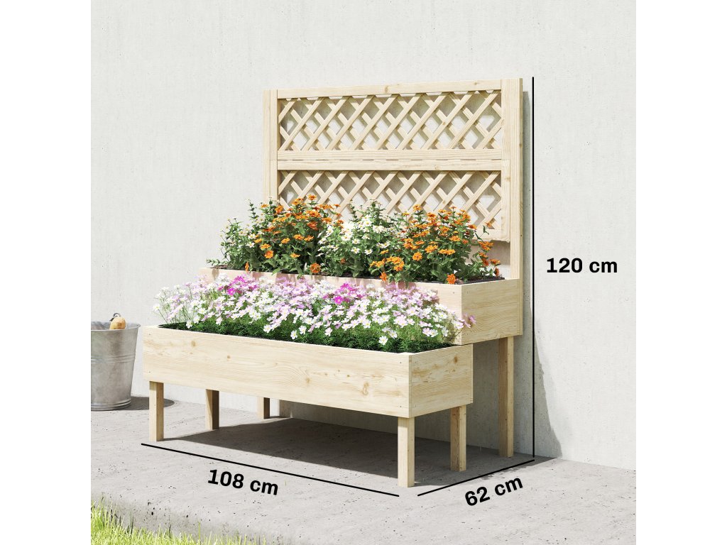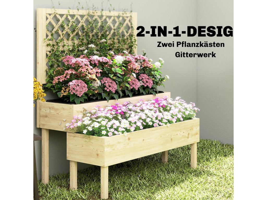 Design dva v jednom: Tento vyvýšený záhon kombinuje dva stupňovité výsadbové truhlíky s treláž, která poskytuje organizovaný prostor pro různé rostliny a popínavé rostliny.