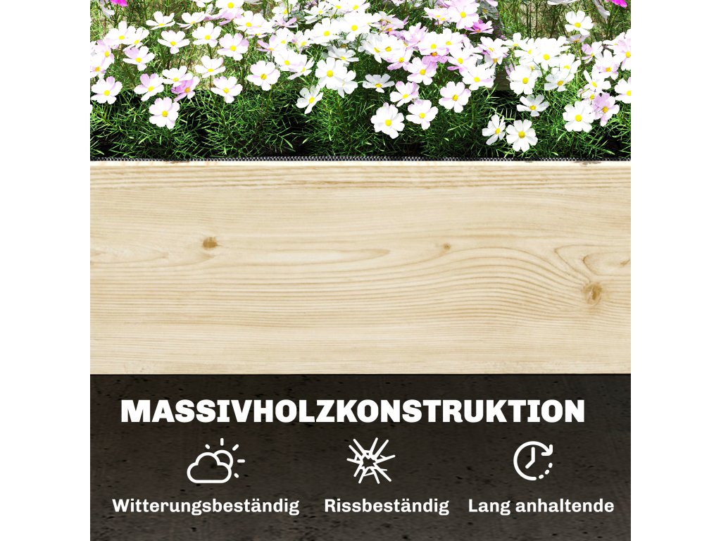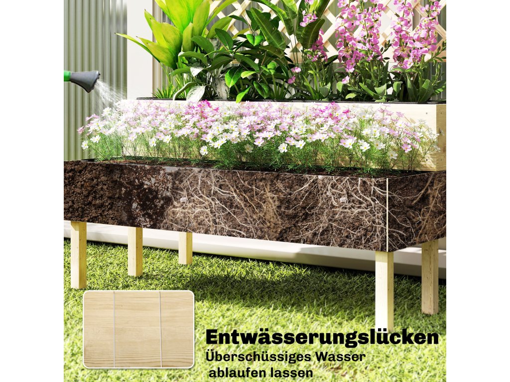 Přírodní jedlové dřevo: Vyvýšený záhon je vyroben z jedlového dřeva s ochranným lakem a má drenážní otvory ve spodní části pro zajištění efektivního odvodnění a zdravých kořenů. Nutná montáž.
