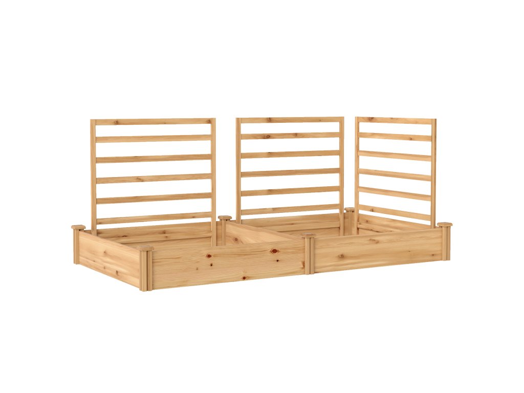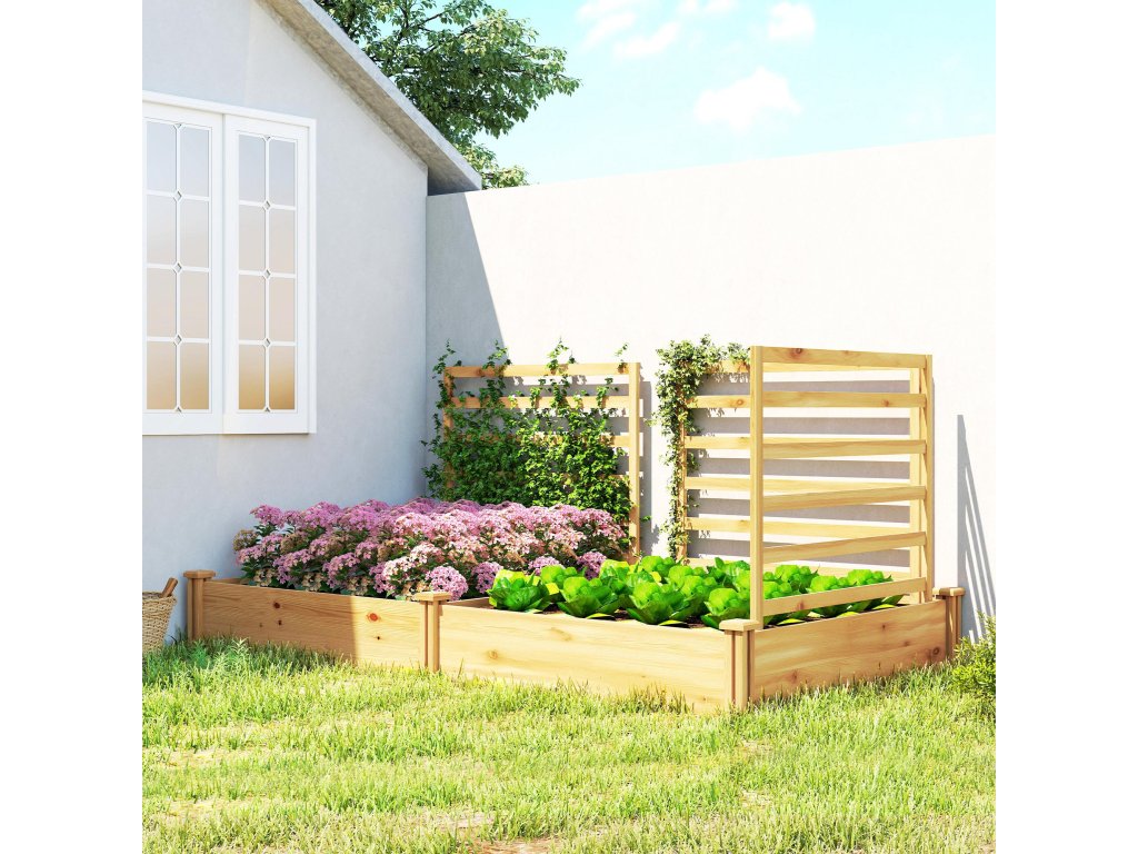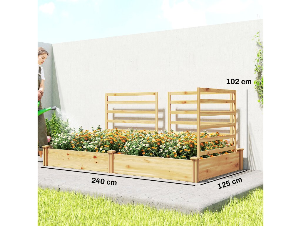 Vyvýšený záhon Outsunny s treláží, dřevěný květináč se 3 treláží, dělicí stěna, otevřené dno, 240 x 125 x 102 cm, přírodní dřevo