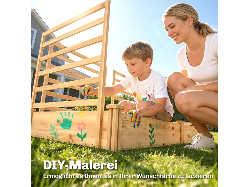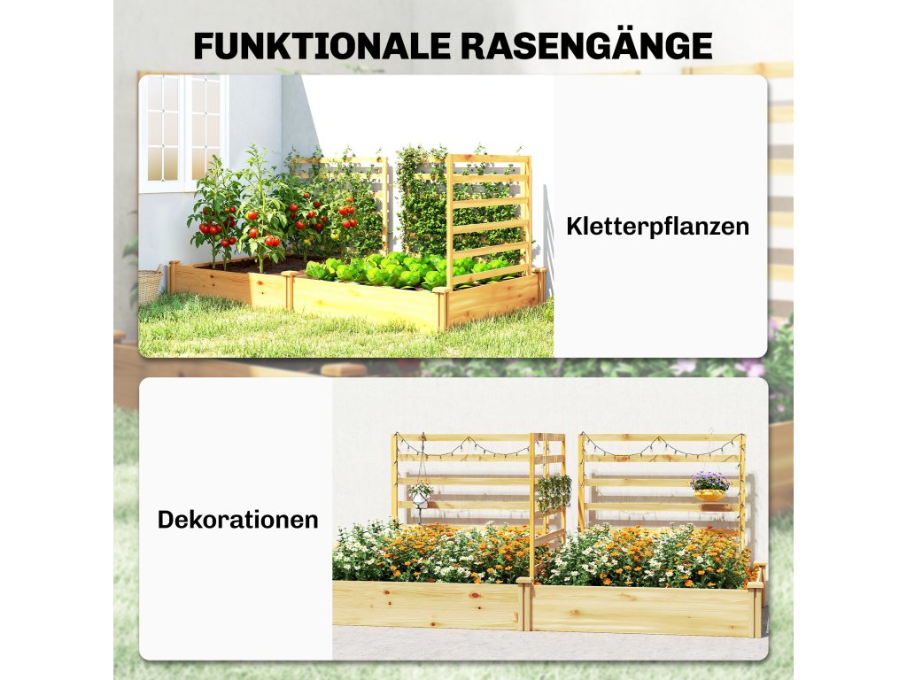 2 truhlíky a 3 popínavé rostliny treláže: Tento dřevěný květináč má dva prostorné truhlíky s dělicí přepážkou, které poskytují oddělené prostory pro různé druhy rostlin. Tři robustní treláže jsou ideální pro popínavé rostliny a lze je dále přizpůsobit dekoracemi.