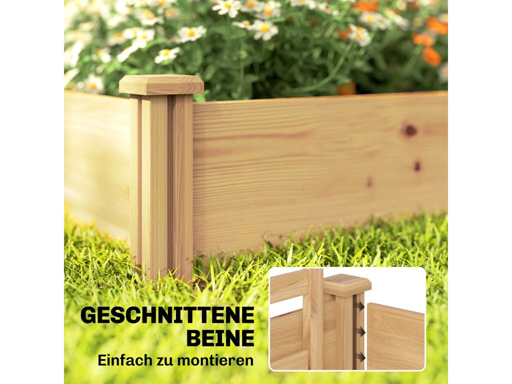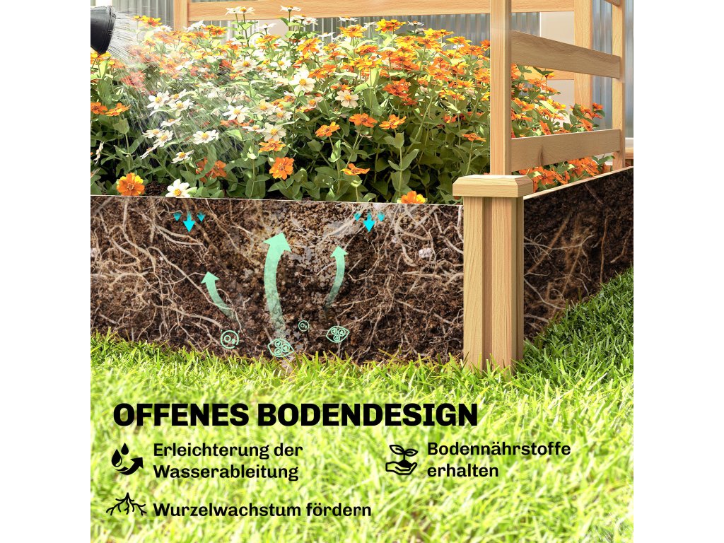 Otevřená základna: Sbohem přemokření! Díky otevřené základně nabízí tento vyvýšený záhon vynikající drenáž, která podporuje zdravý růst kořenů. Zároveň mohou vaše rostliny růst hluboko do půdy a efektivně absorbovat důležité živiny.