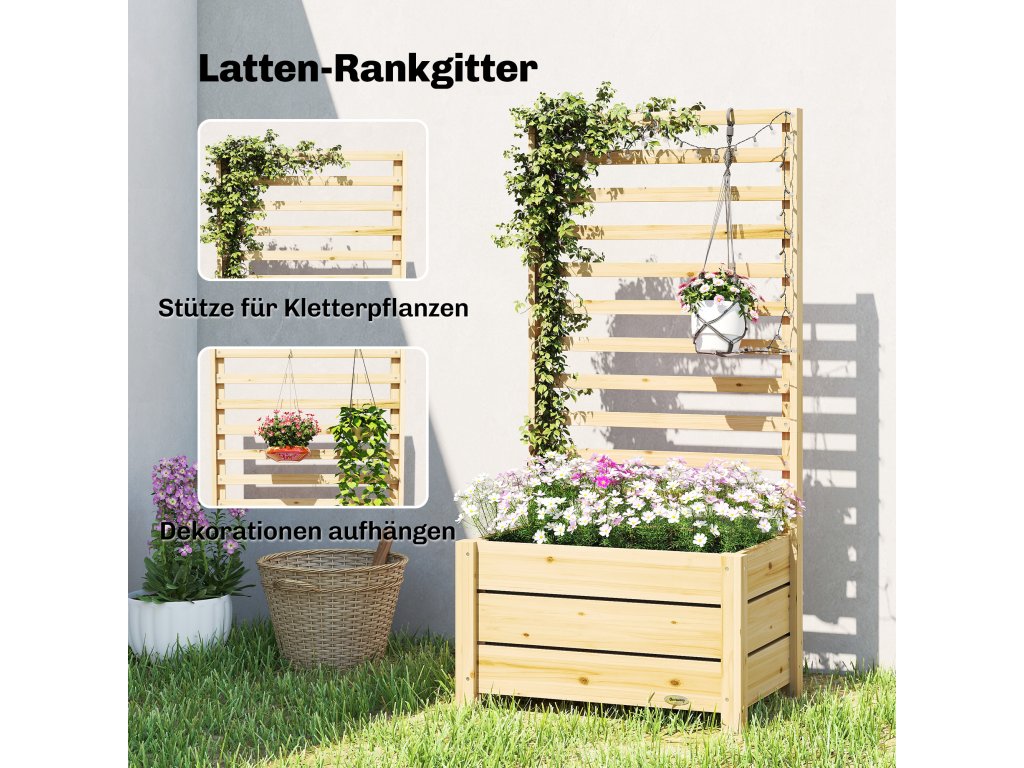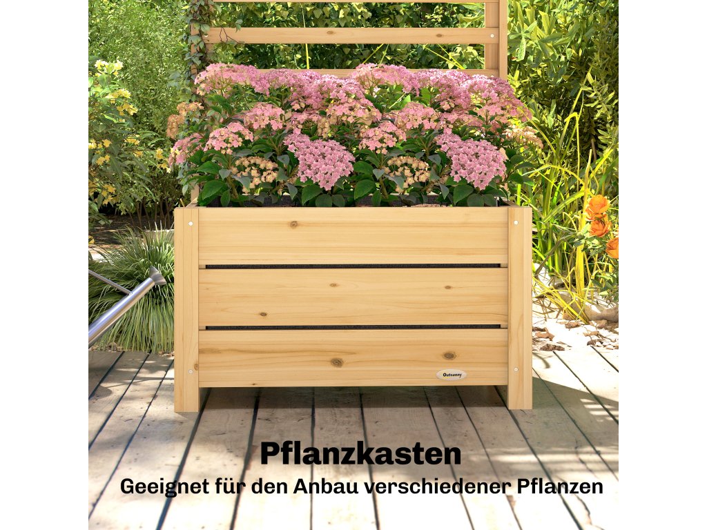 Dodá vašemu venkovnímu prostoru eleganci a funkčnost s květináčem Outsunny s mřížoví. Tento dřevěný vyvýšený záhon, vyrobený z povětrnostně odolného jedlového dřeva, nabízí stabilitu a odolnost. Je ideální pro popínavé rostliny, jako jsou plaménky, růže a mučenky. Velkoryslá výsadbová plocha poskytuje dostatek prostoru pro květiny, bylinky nebo zeleninu a promění balkony, terasy nebo zahrady v rozkvetlé mini oázy.