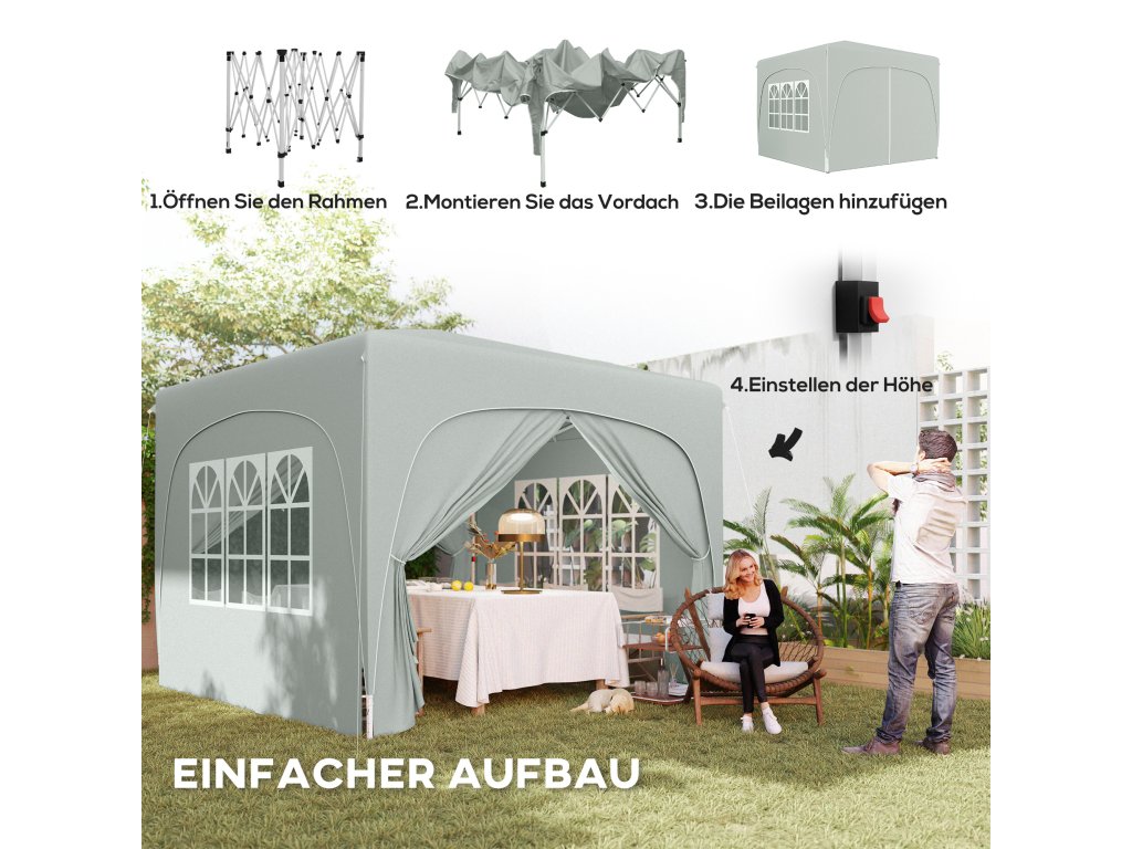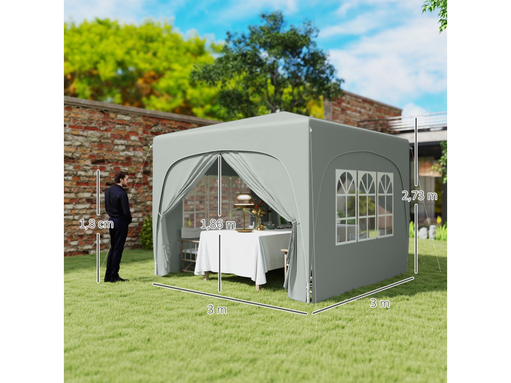 Zažijte venkovní akce bez námahy s altánem Outsunny s bočními stěnami! Tento skládací altán o rozměrech 3 x 3 metry se rozloží během okamžiku, nabízí ochranu UPF50+ a vynikající větrání díky dvěma oknům a dvěma dveřím. Díky výškově nastavitelným nohám je párty stan ideální jako zahradní stan, stánek na trhu nebo stan.