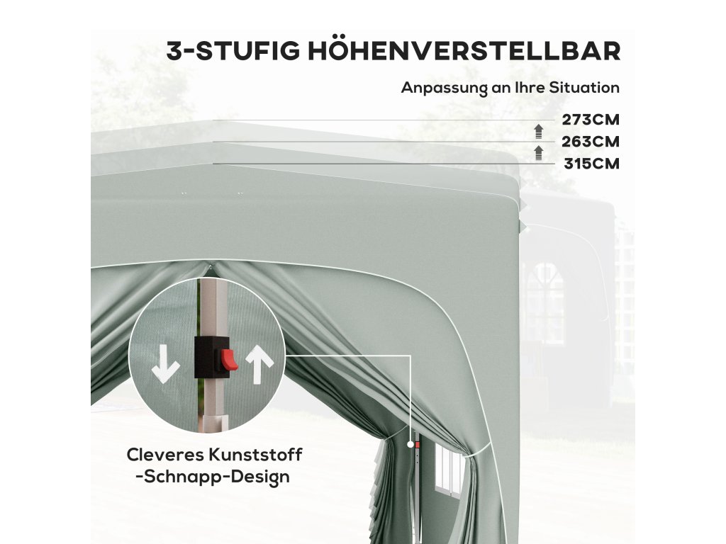 - Nastavitelná výška: Třístupňově nastavitelné kovové nohy tohoto zahradního stanu umožňují snadné nastavení výšky (273/263/253 cm), což je ideální pro různé venkovní akce a osobní preference.