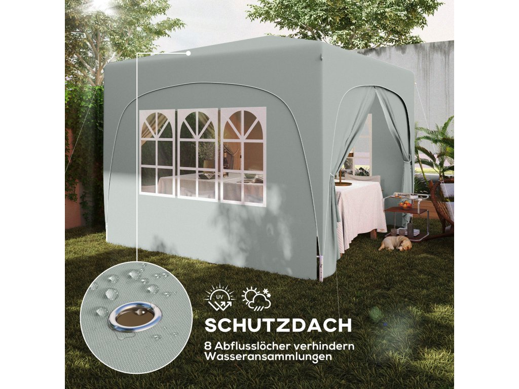 - Ochrana proti UV záření: Altán vyrobený z odolné tkaniny UPF50+ Oxford chrání 98 % UV záření. Osm odtokových otvorů zabraňuje hromadění vody, takže jste vždy chráněni. (Altán by neměl být ponechán venku za extrémních povětrnostních podmínek)