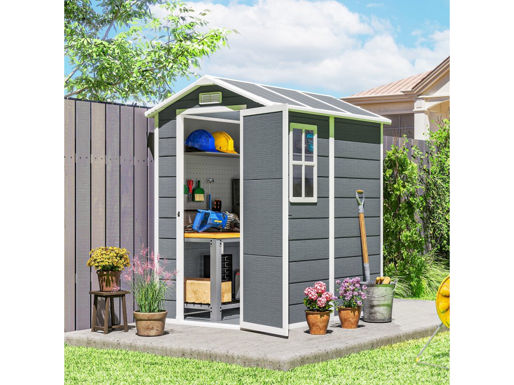 Zahradní domek Outsunny, plastový zahradní domek s podlahou, okny, uzamykatelnými dveřmi, na zahradu, 131Š x 186H x 198V cm, šedý