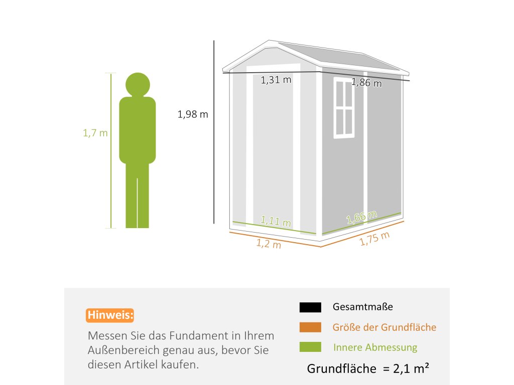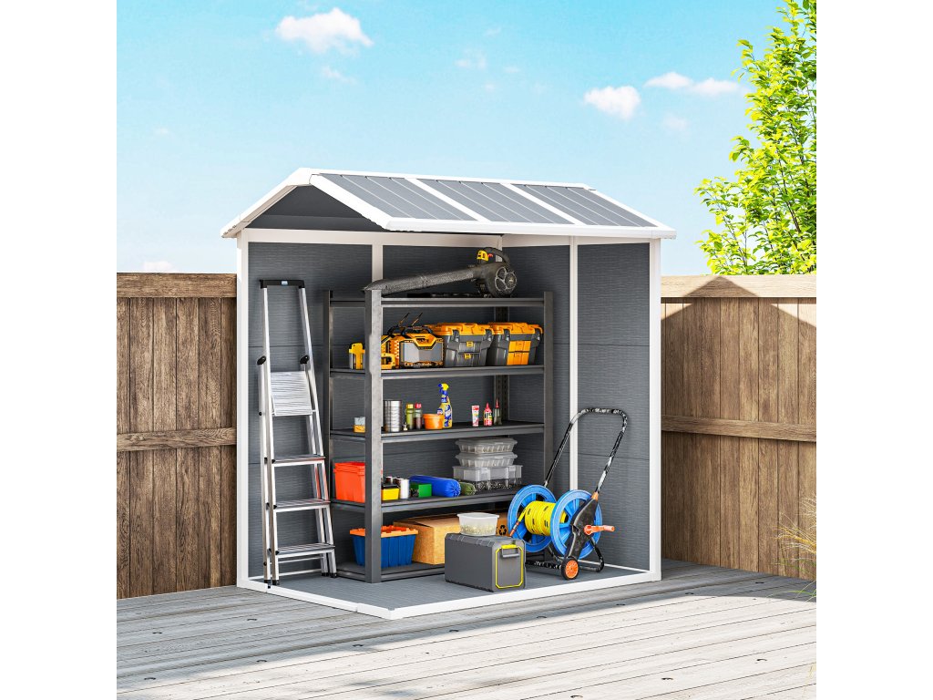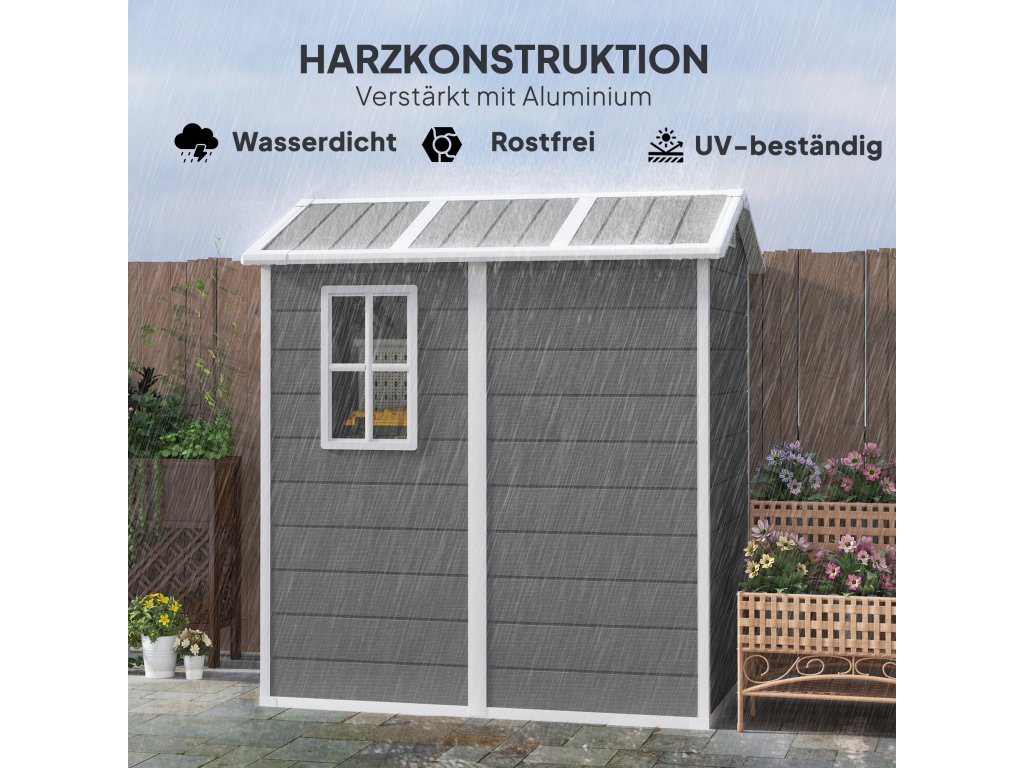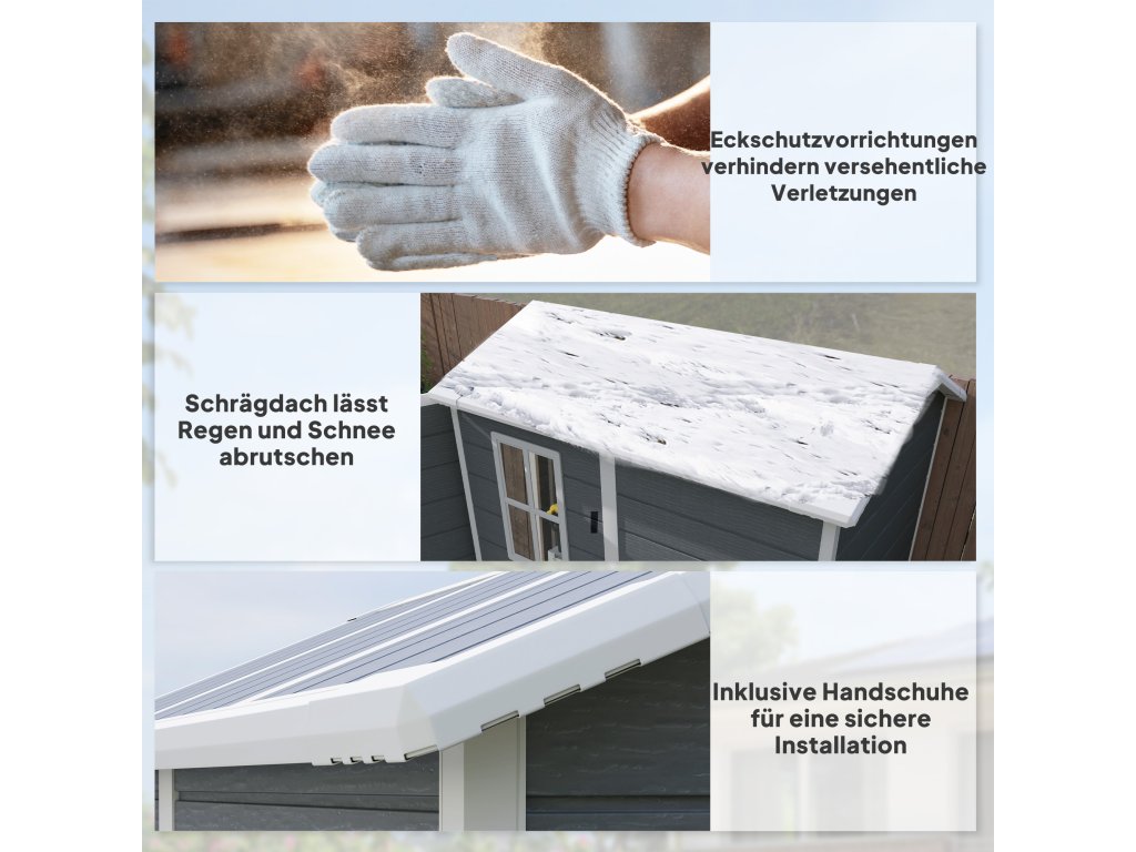 - Bezpečný a přístupný: Zahradní přístřešek je vybaven dveřmi, závorou a zámkem pro zvýšení bezpečnosti. Šikmá střecha chrání před hromaděním vody a sněhu