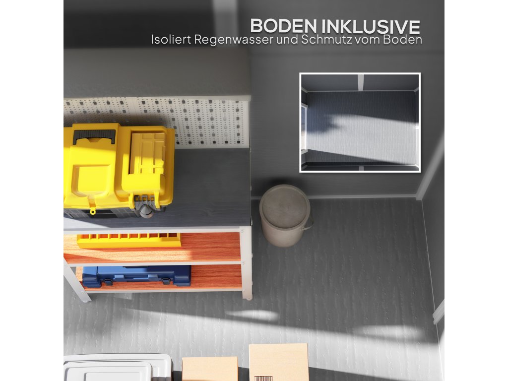 - Robustní konstrukce: Tento přístřešek na nářadí je vyroben z 12mm polypropylenové pryskyřice s dřevěným efektem a vyztužen hliníkem, je vodotěsný, odolný proti UV záření a korozi a jeho podlaha zabraňuje vnikání dešťové vody