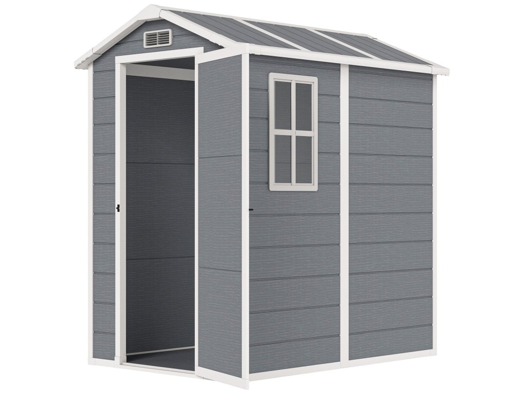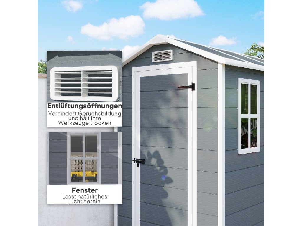 - Přirozené světlo a větrání: Tato kůlna je vybavena průhledným oknem pro přirozené světlo a dvěma větracími otvory pro zajištění optimální cirkulace vzduchu. Ideální pro venkovní použití