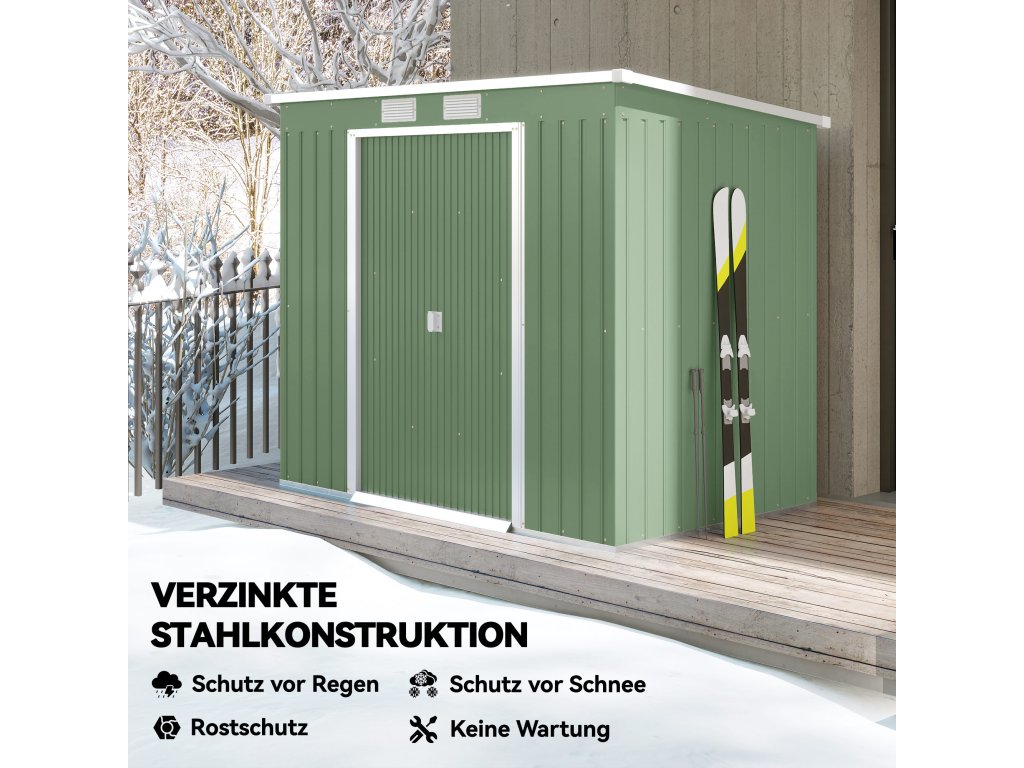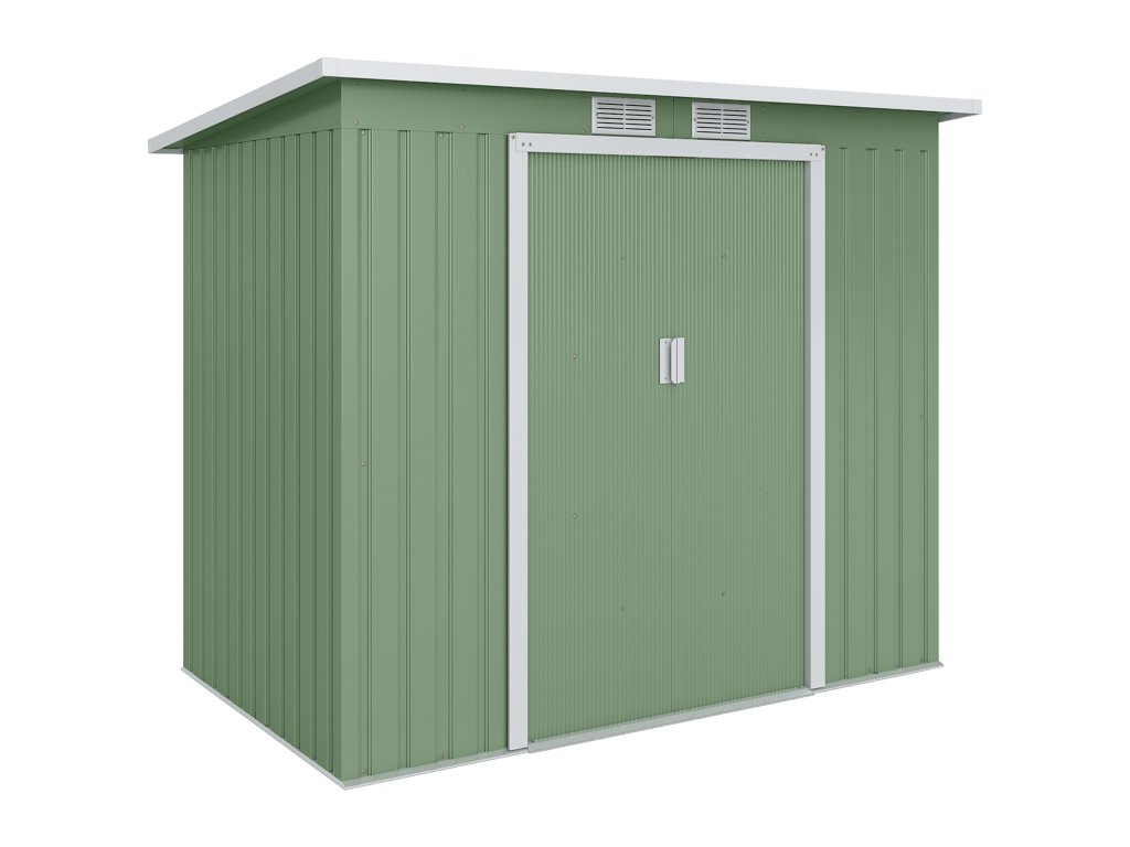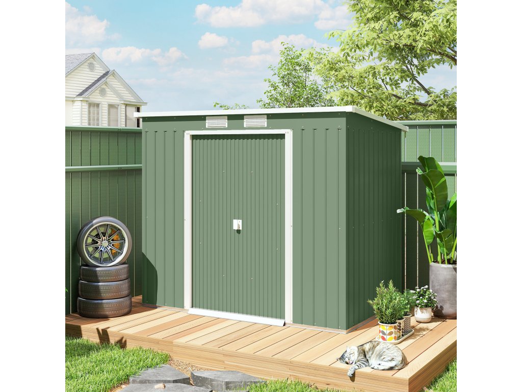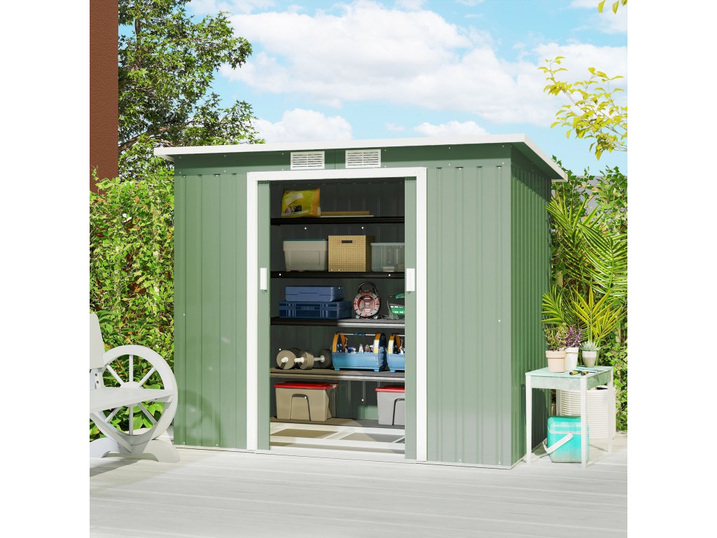Zahradní domek Outsunny s větracími okny a posuvnými dveřmi, pozinkovaná ocel, 213 x 130 x 159 cm, zelená