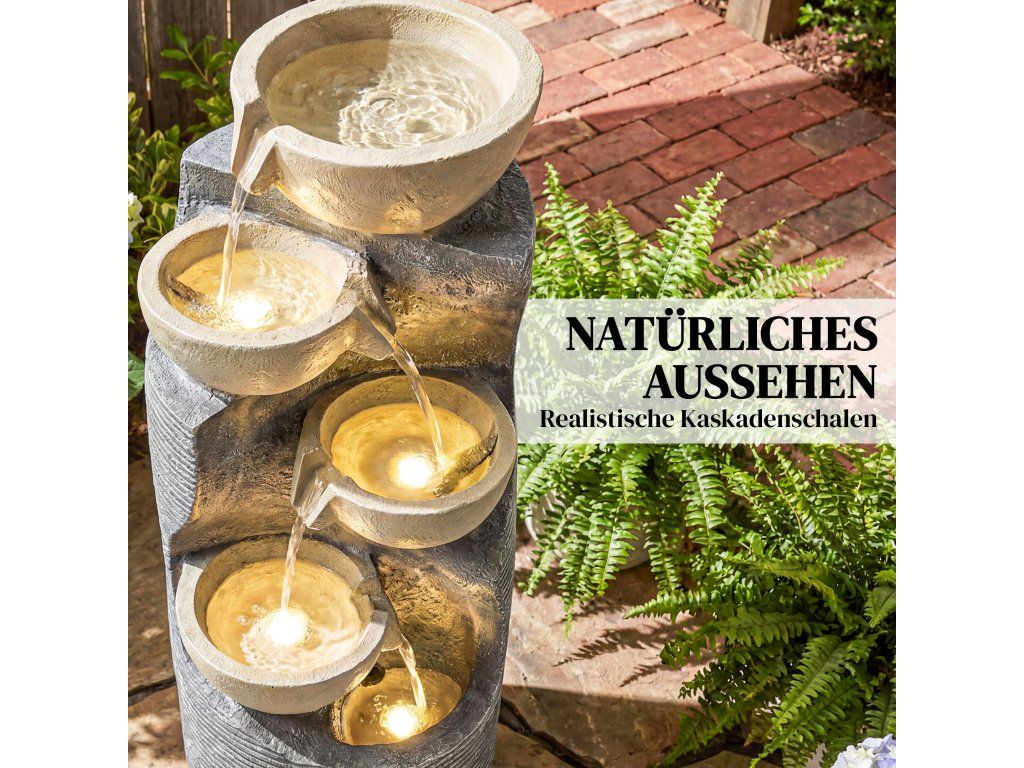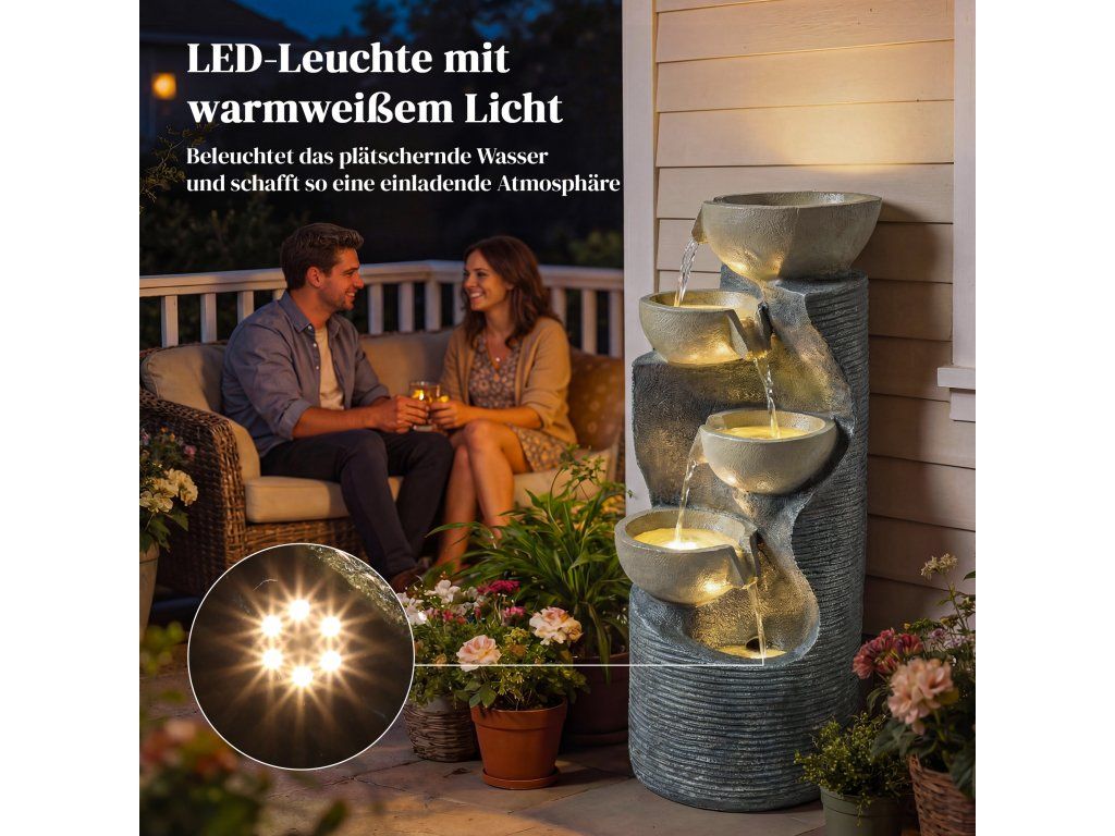Podmanivá atmosféra teplého světla: Integrované LED diody vytvářejí měkké, teplé světlo, které stylově zvýrazňuje tekoucí vodu a proměňuje zahradní fontánu v ústřední bod večera s útulnou, romantickou atmosférou.