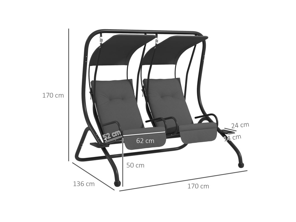 Zahradní houpačka Outsunny Hollywood Swing, odolná proti povětrnostním vlivům, 2 samostatné velikosti, 2 držáky na nápoje, 170 cm x 136 cm x 170 cm, šedá