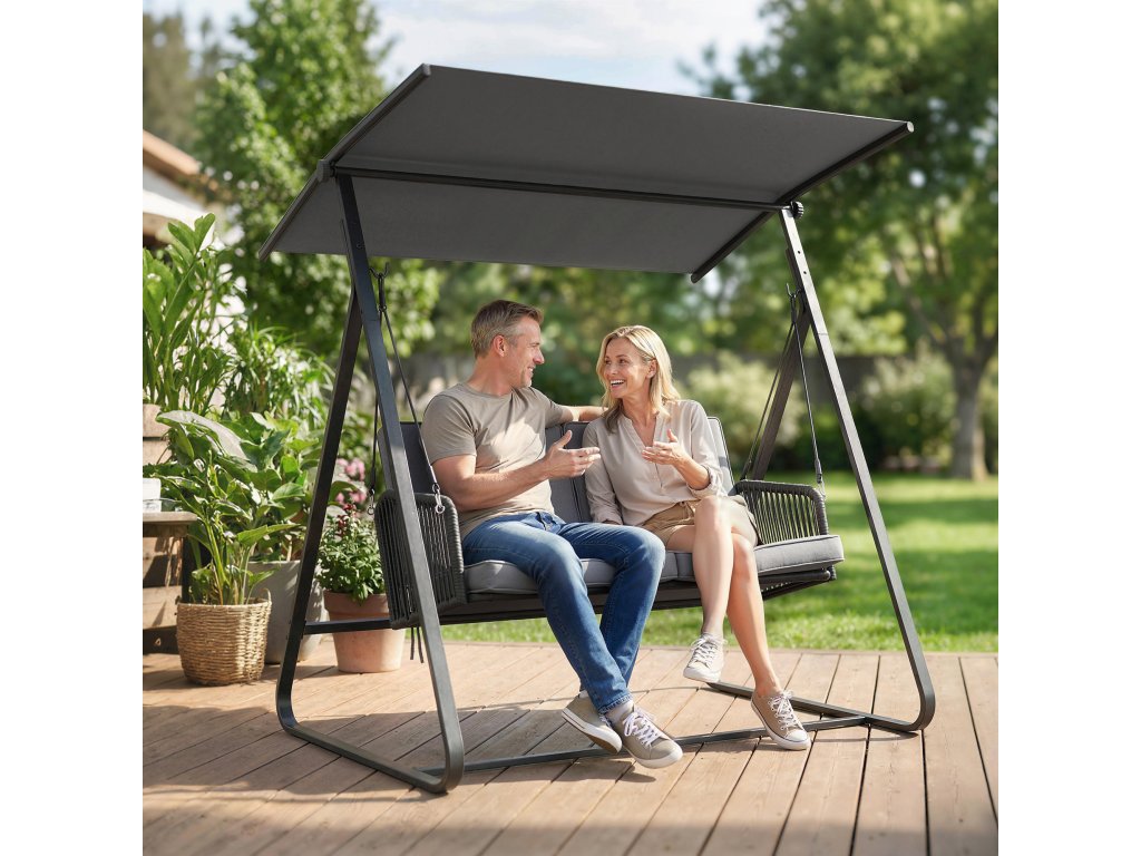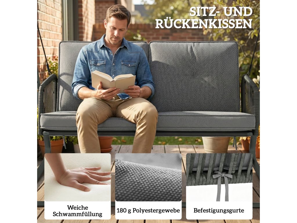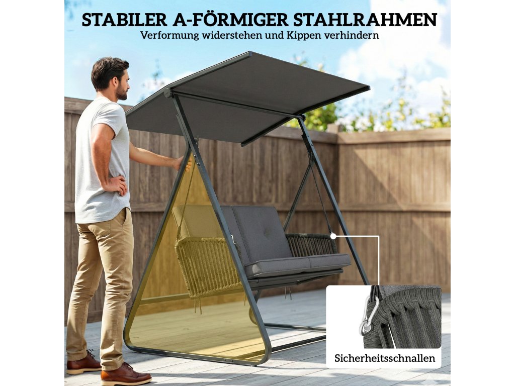 ✔ Dvojitá lana a čtyři bezpečnostní přezky zajišťují stabilitu terasové houpačky
