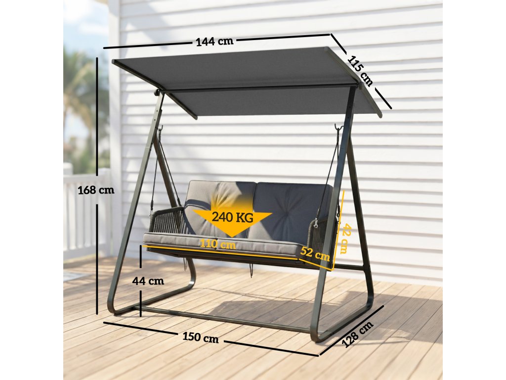 Celkové rozměry: 150Š x 128H x 168V cm. Velikost stříšky: 144Š x 115H cm. Velikost sedáku: 110Š x 52H x 44V cm. Velikost opěradla: 110Š x 42V cm. Nutná montáž.