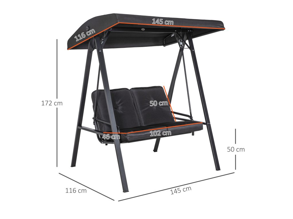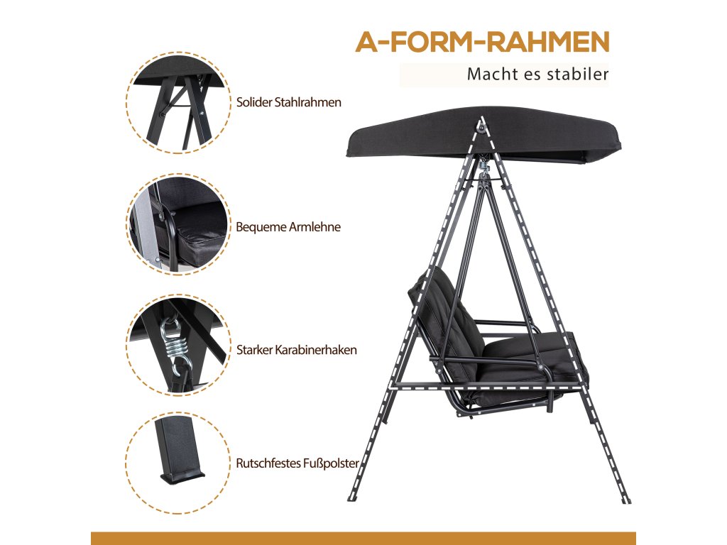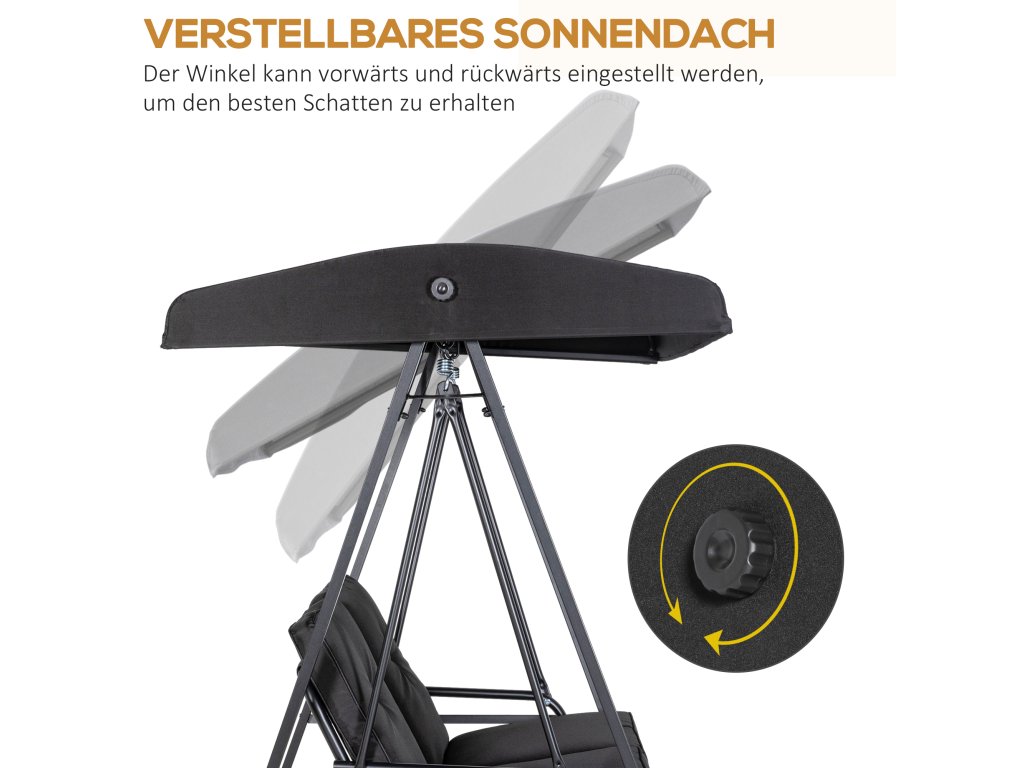 Houpačka se 2 místy: Tato zahradní houpačka s baldachýnem pohodlně usadí dvě osoby. Oblouková stříška chrání před sluncem a deštěm, zatímco silné polstrování zajišťuje pohodlí