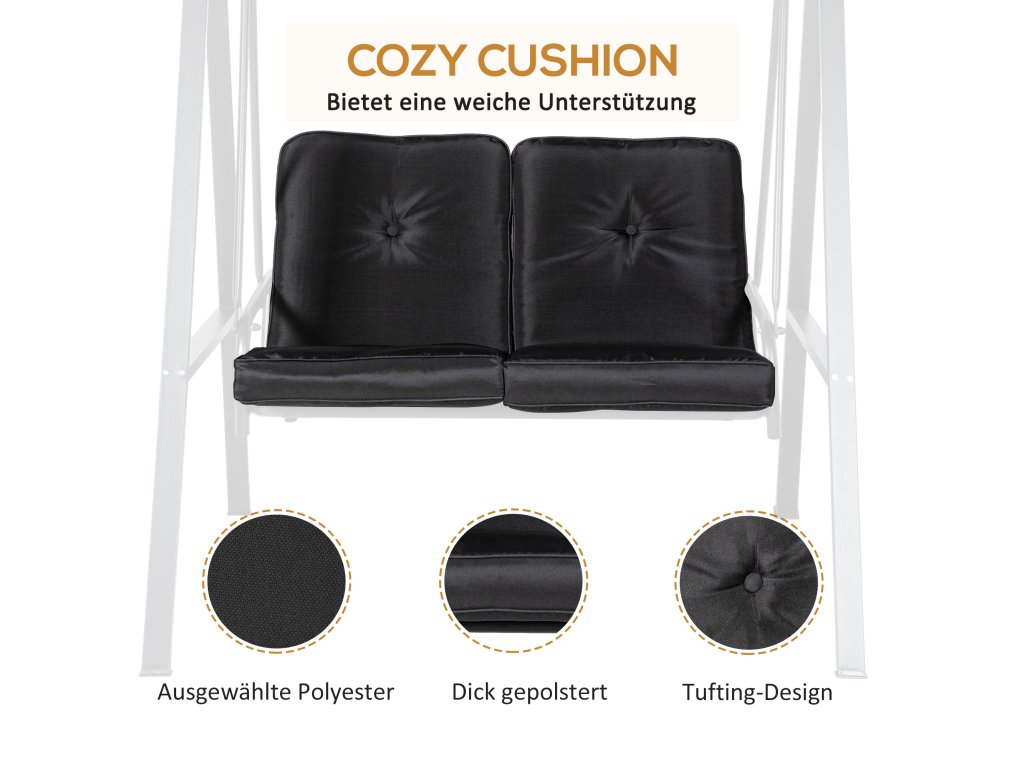 Polstrované sedadlo: Dva silně polstrované, snadno čistitelné polštáře poskytují maximální pohodlí. Vhodné jako houpačka na verandu pro venkovní použití