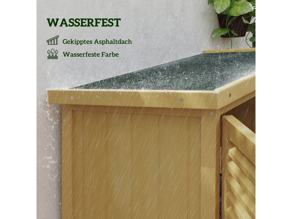 - Odolnost vůči povětrnostním vlivům a robustnost: Díky šikmé, bitumenové střeše a konstrukci z předem naolejovaného borovicového a smrkového dřeva odolá tato skříňka na nářadí jakémukoli počasí.