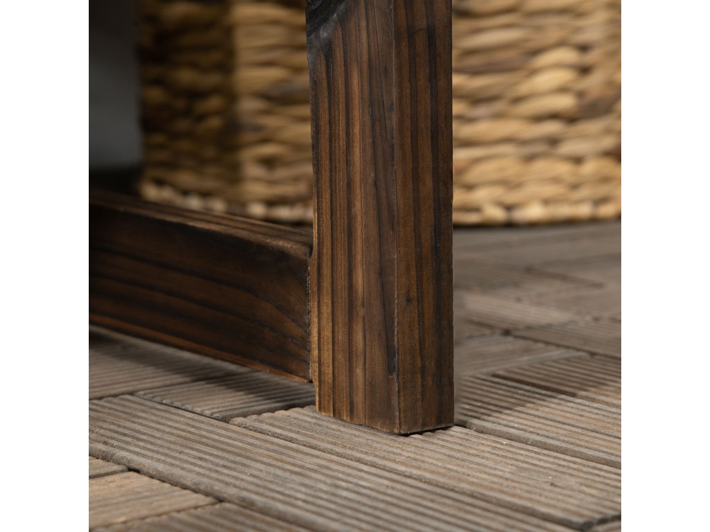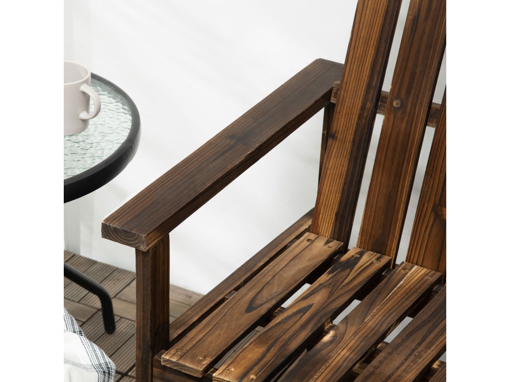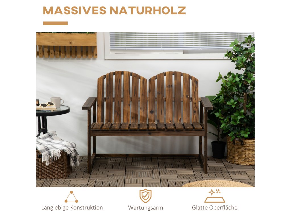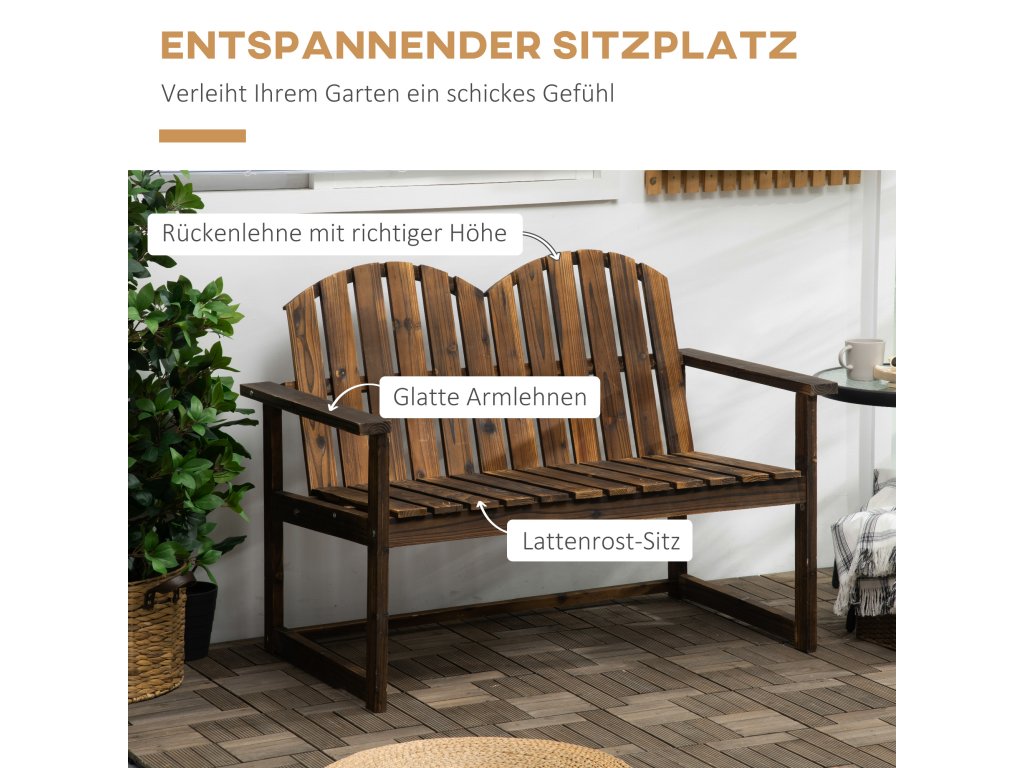 - Přírodní jedlové dřevo: Tato zahradní lavička je díky své robustní konstrukci z jedlového dřeva ideální pro venkovní použití. Lavička má karbonizovaný povrch pro větší odolnost