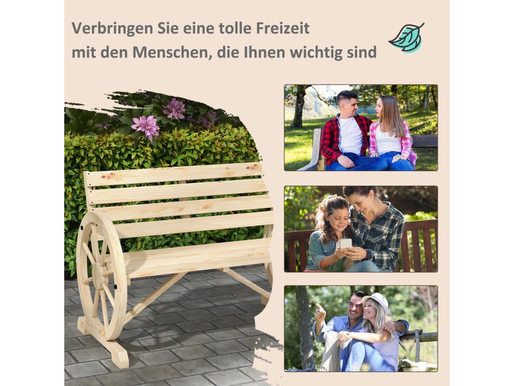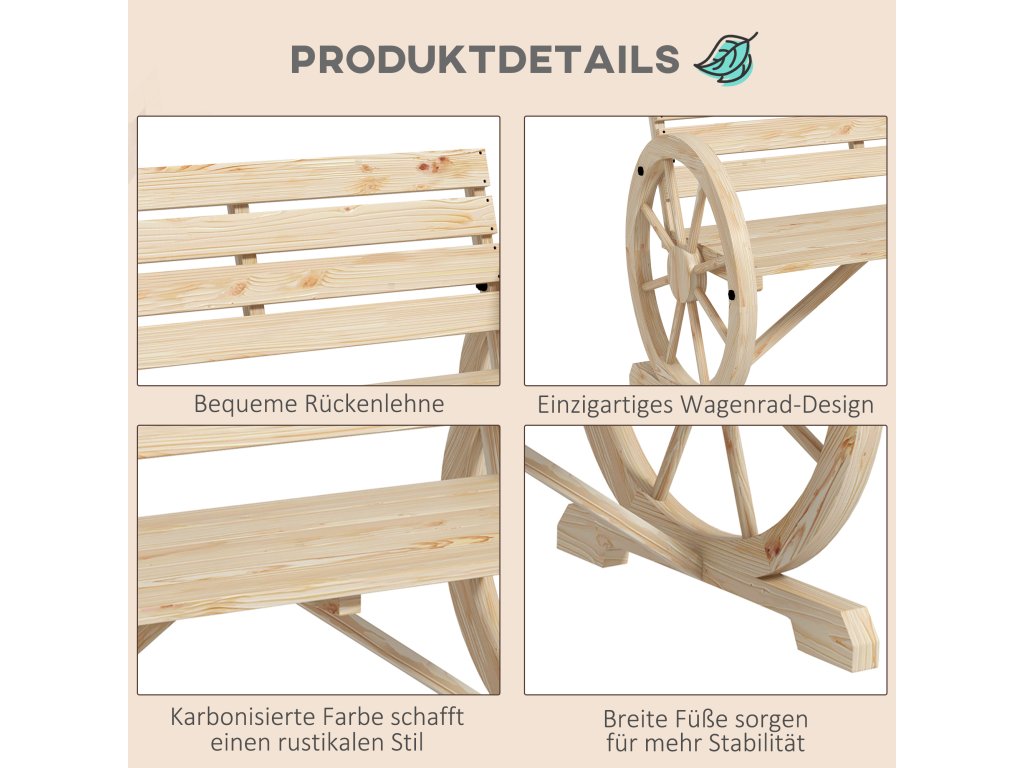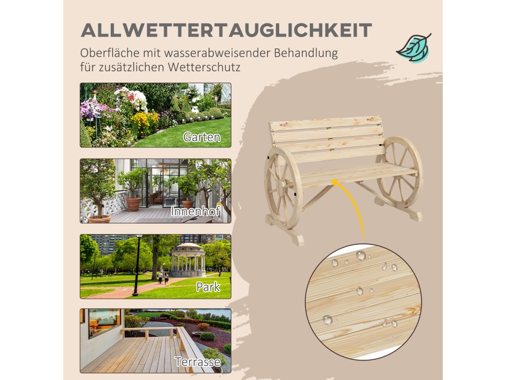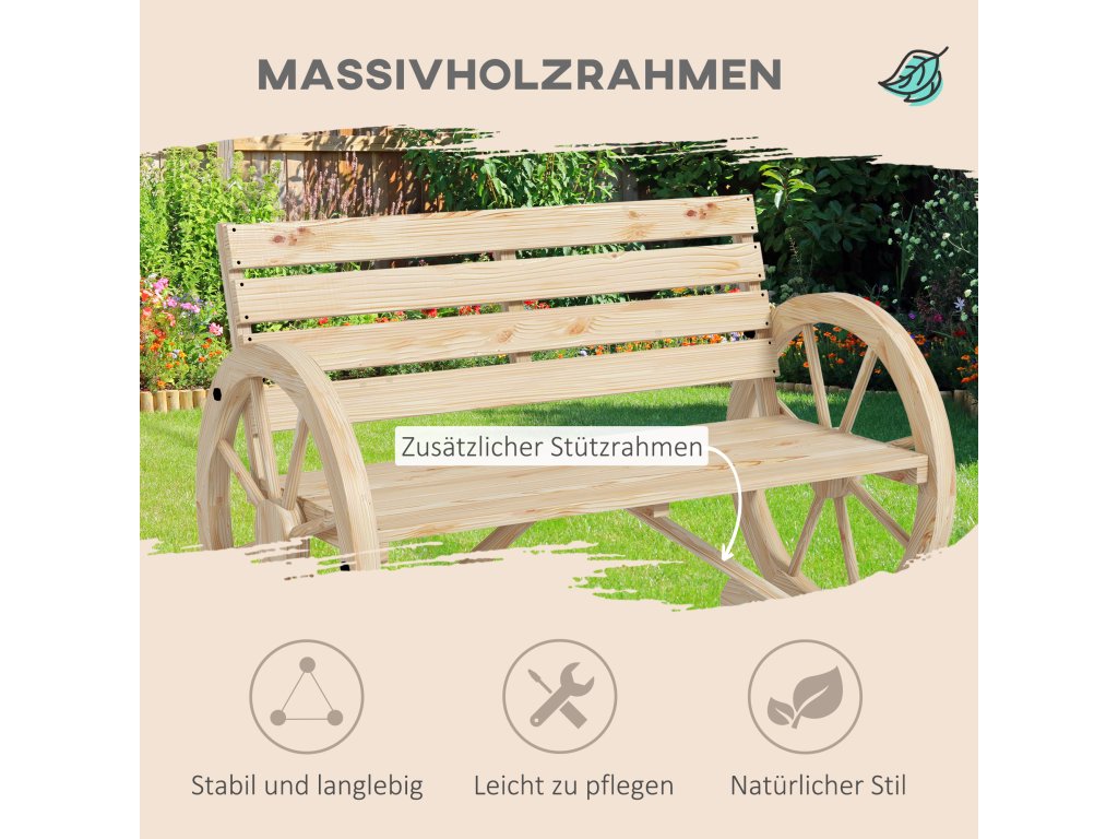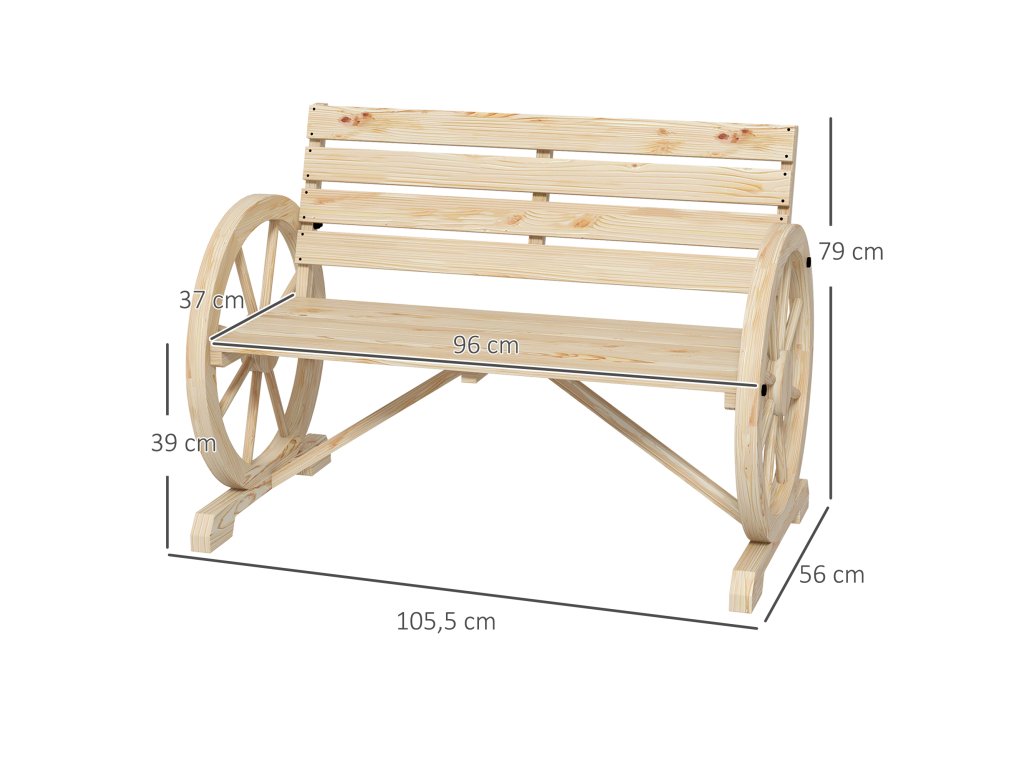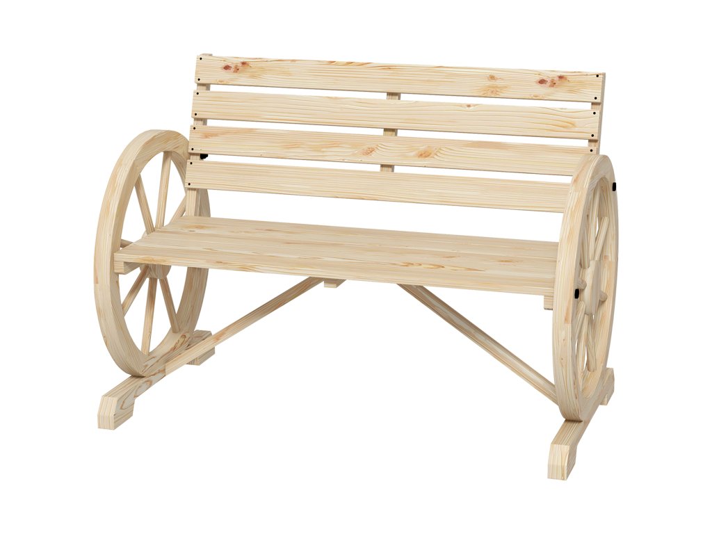 Doplňte svou terasu nebo zahradu o tuto rustikální zahradní lavičku od společnosti Outsunny, na které můžete sedět a odpočívat na svém oblíbeném venkovním místě. Tato lavice je vyrobena z masivního jedlového dřeva a je robustní, takže na ní mohou odpočívat až dvě osoby na slunci nebo ve stínu. Dvě područky mají jedinečný design kola od vozu, který poskytuje prostor pro vaše ruce a jistě z této lavičky udělá konverzační kousek.