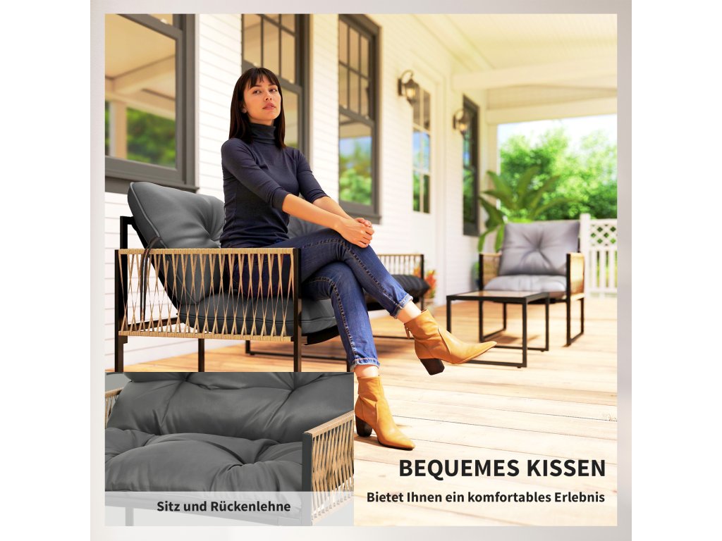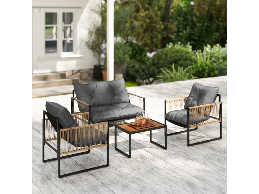 - Čistá venkovní relaxace: užijte si příjemné hodiny na verandě, na zahradě nebo v jiných venkovních prostorách s touto 4dílnou ratanovou sedací soupravou, která se skládá z pohovky, 2 křesel a konferenčního stolku. Ratanový vzhled a dekorace v podobě knoflíků dodají vašemu venkovnímu prostoru nádherný dekorativní nádech