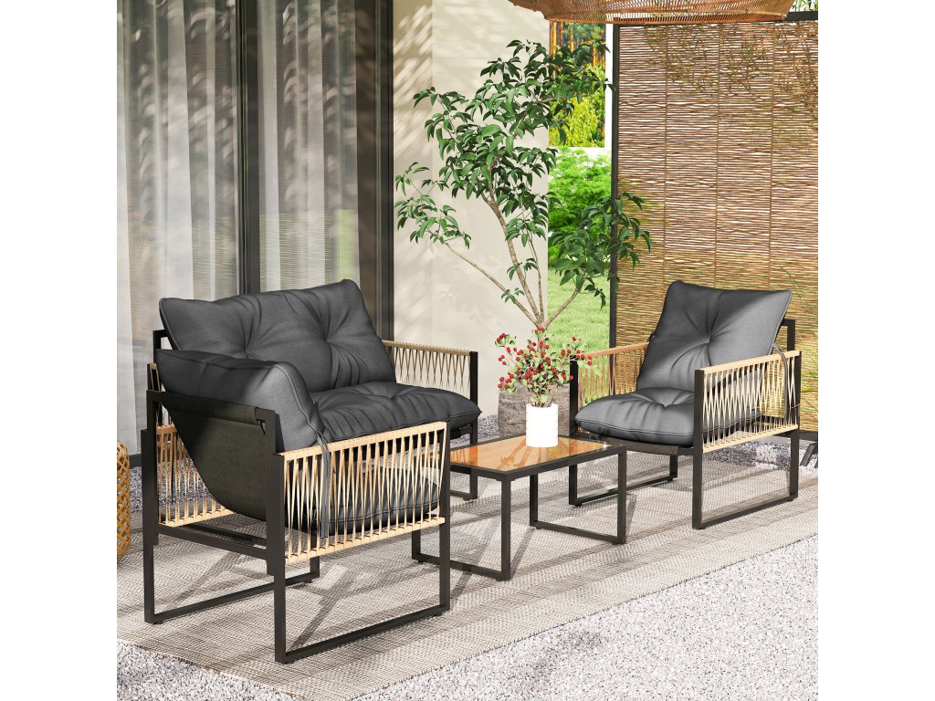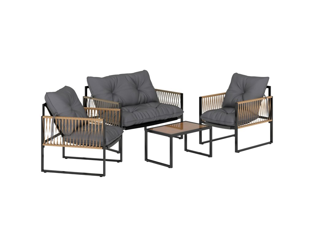 Zahradní nábytek Outsunny, 4dílný set, pohovka, 2 křesla, stůl se skleněnou deskou, kovový rám, polyratan, antracitová barva