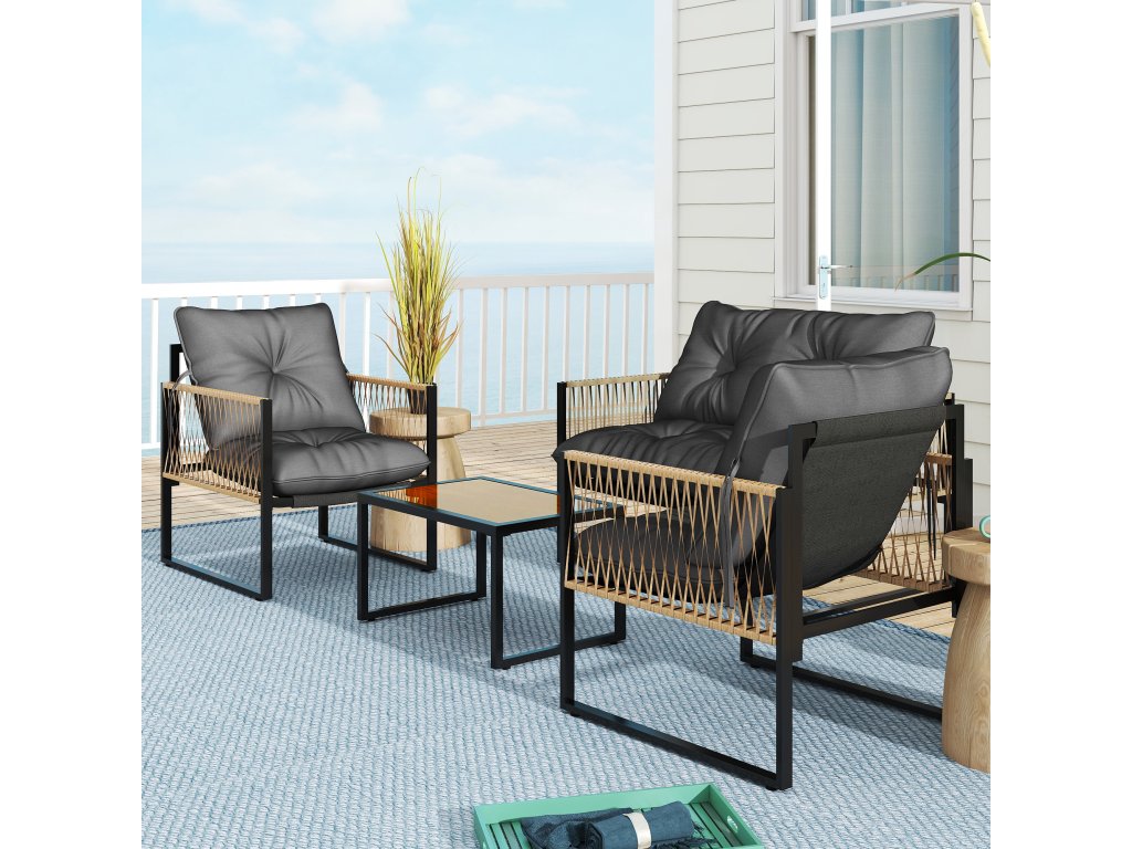 - ✔ Ratanová sedací souprava obsahuje 2místnou pohovku, dvě křesla a odpovídající konferenční stolek se skleněnou deskou a dřevěnou povrchovou úpravou