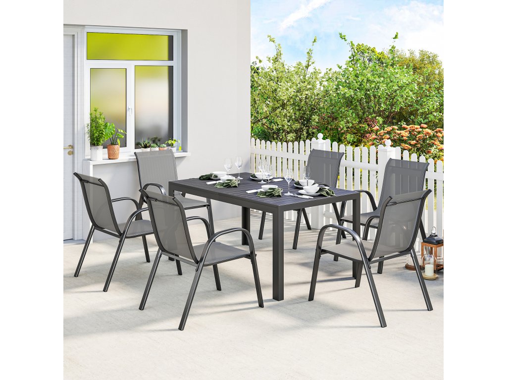 Zahradní nábytek Outsunny, 7dílná sedací souprava se stolem a 6 prodyšnými stohovatelnými židlemi, lamelový design, světle šedá
