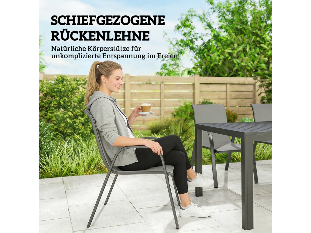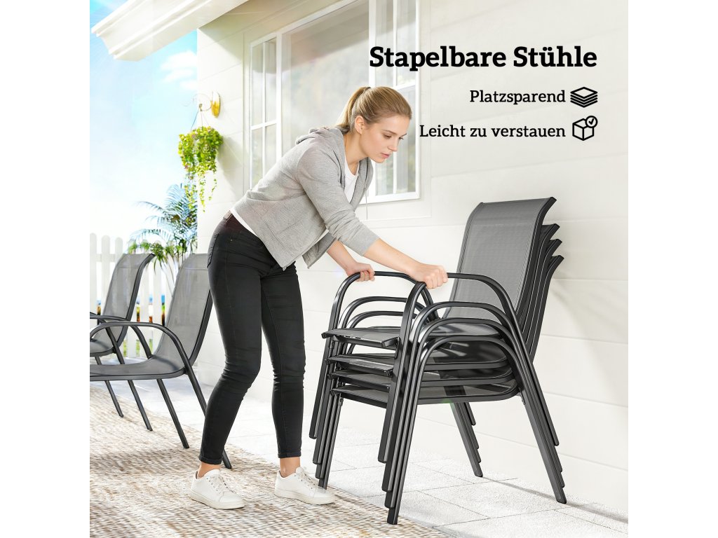 Prostorově úsporné stohovatelné židle: Po večírku jednoduše šest židlí kompaktně stohujte na rozměry 82D x 55Š x 128V cm. Ušetřete místo a bez námahy uskladněte sadu zahradního nábytku – ideální pro menší venkovní prostory.