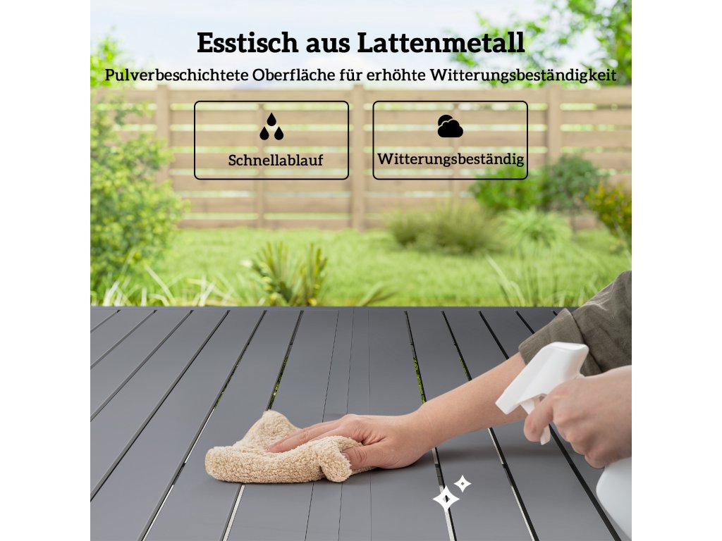 Snadná údržba: Odolný zahradní nábytek z práškově lakované oceli odolává povětrnostním vlivům, rzi a opotřebení. Laťková kovová deska stolu podporuje cirkulaci vzduchu a usnadňuje čištění.