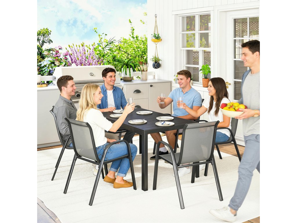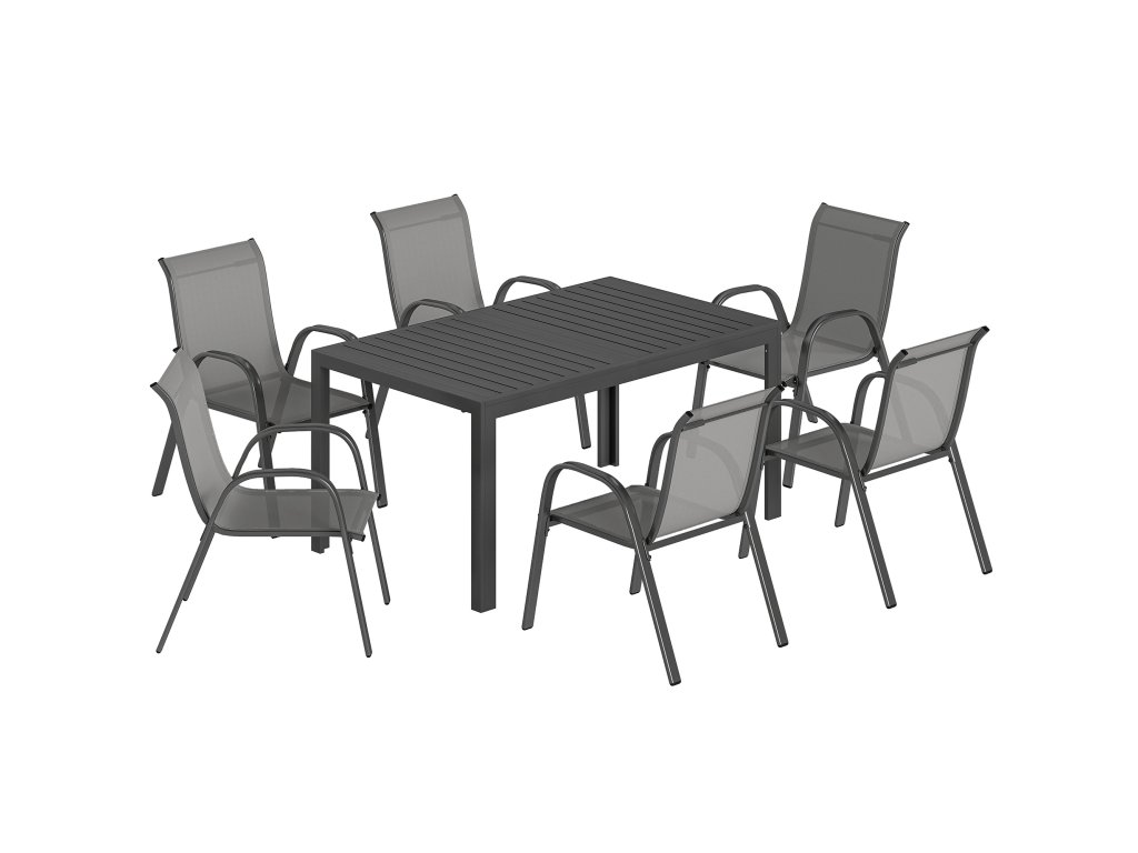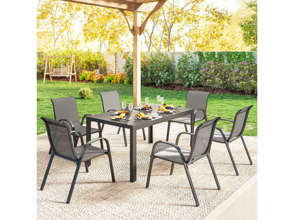 Sedmidílná sada na terasu: Užijte si příjemné chvíle s touto elegantní sedací soupravou, která se skládá z obdélníkového stolu a šesti stohovatelných židlí. Ideální pro útulné rodinné večeře nebo živé zahradní párty.