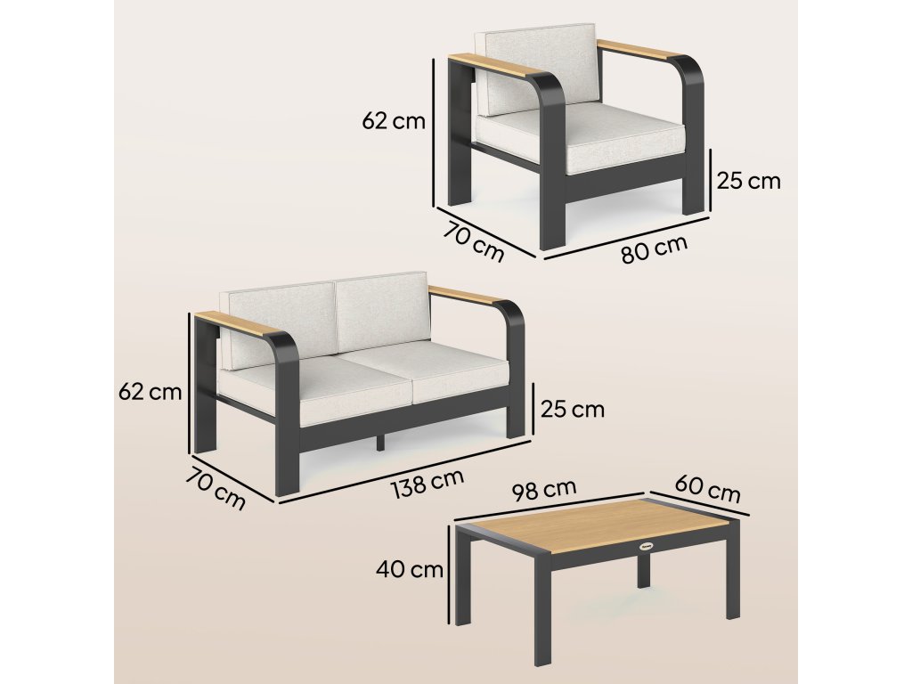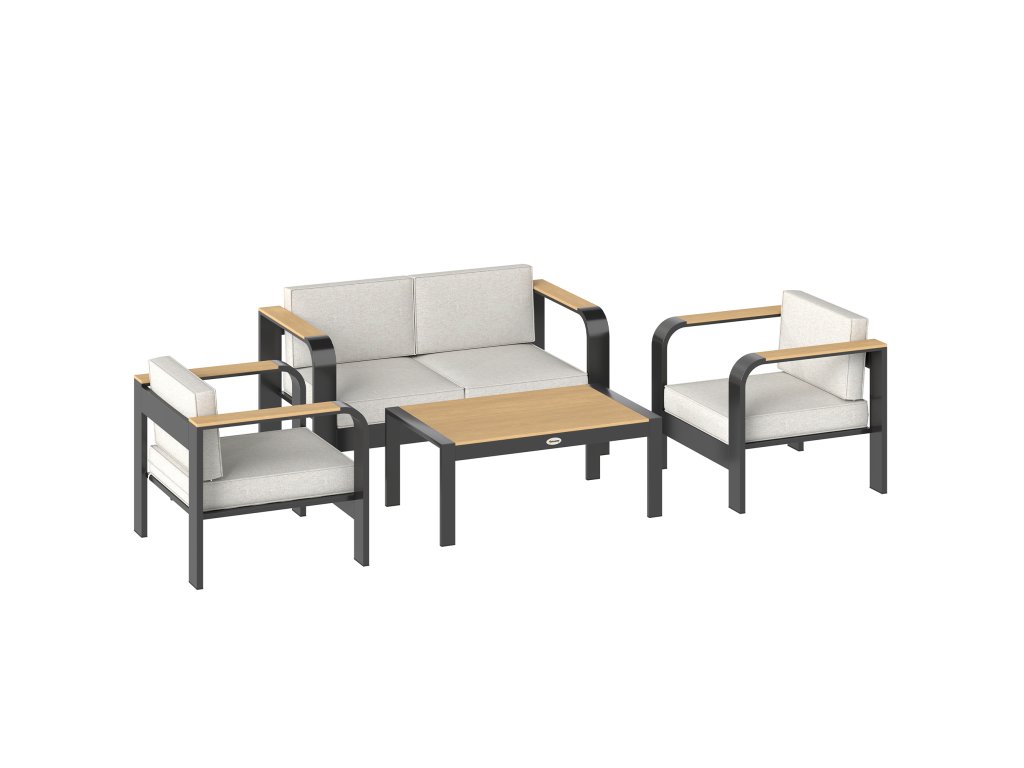 Zahradní nábytek Outsunny, hliníková sedací souprava pro 4 osoby, vodoodpudivá, extra hluboká, s dvoumístnou pohovkou, 2 křesly a odkládacím stolkem.