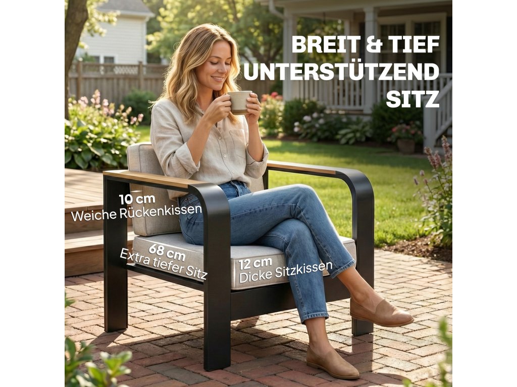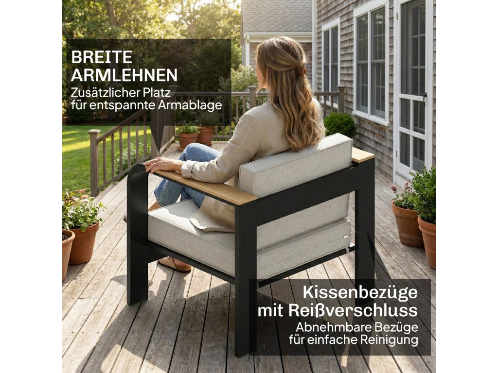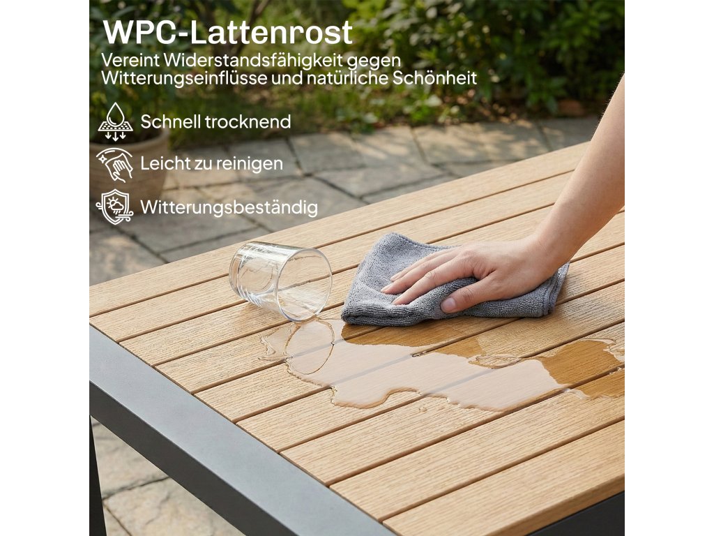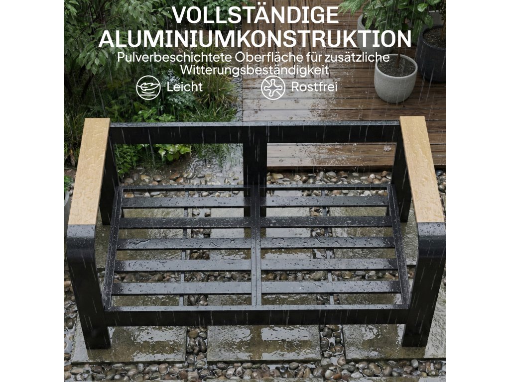 Hliníkový rám: Práškově lakované hliníkové rámy poskytují stabilitu, jsou lehké, nerezavějící a ideální pro venkovní použití. 10 cm široké područky z WPC dodávají pohodlí a přirozené zahradní kouzlo.