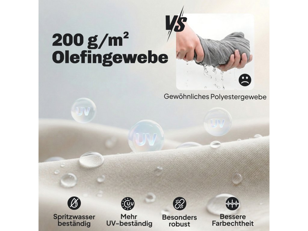 ✔ Olefinová tkanina 200 g/m², odolná vůči UV záření, blednutí, vodě a roztržení, se zipem pro snadné vyjmutí