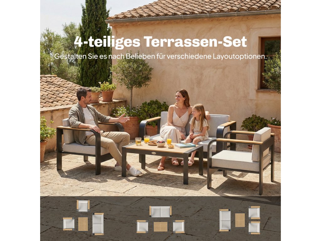 ✔ Čtyřdílná modulární sada zahradního nábytku: jedna pohovka, dvě křesla a jeden konferenční stolek