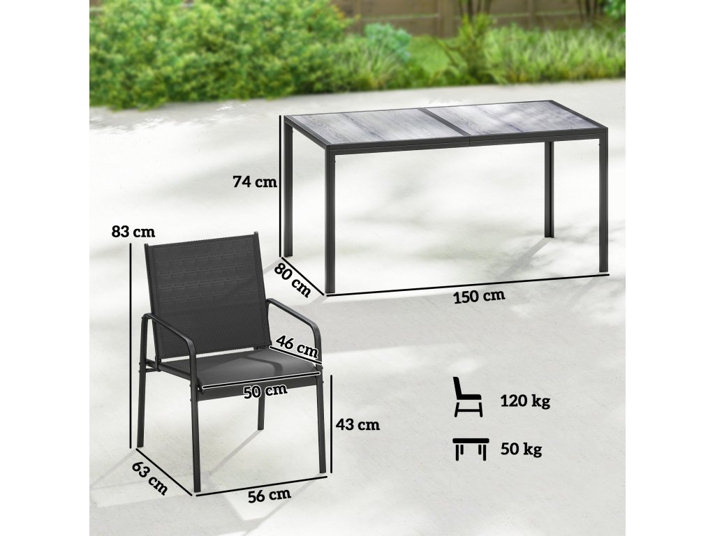 Informace o produktu: Rozměry židle: 56Š x 63H x 83V cm. Rozměry stolu: 150D x 80Š x 74V cm. Rozměry sedáku: 50Š x 46H cm. Výška sedáku: 43 cm. Nosnost: 120 kg (židle), 50 kg (stůl). Nutná montáž.