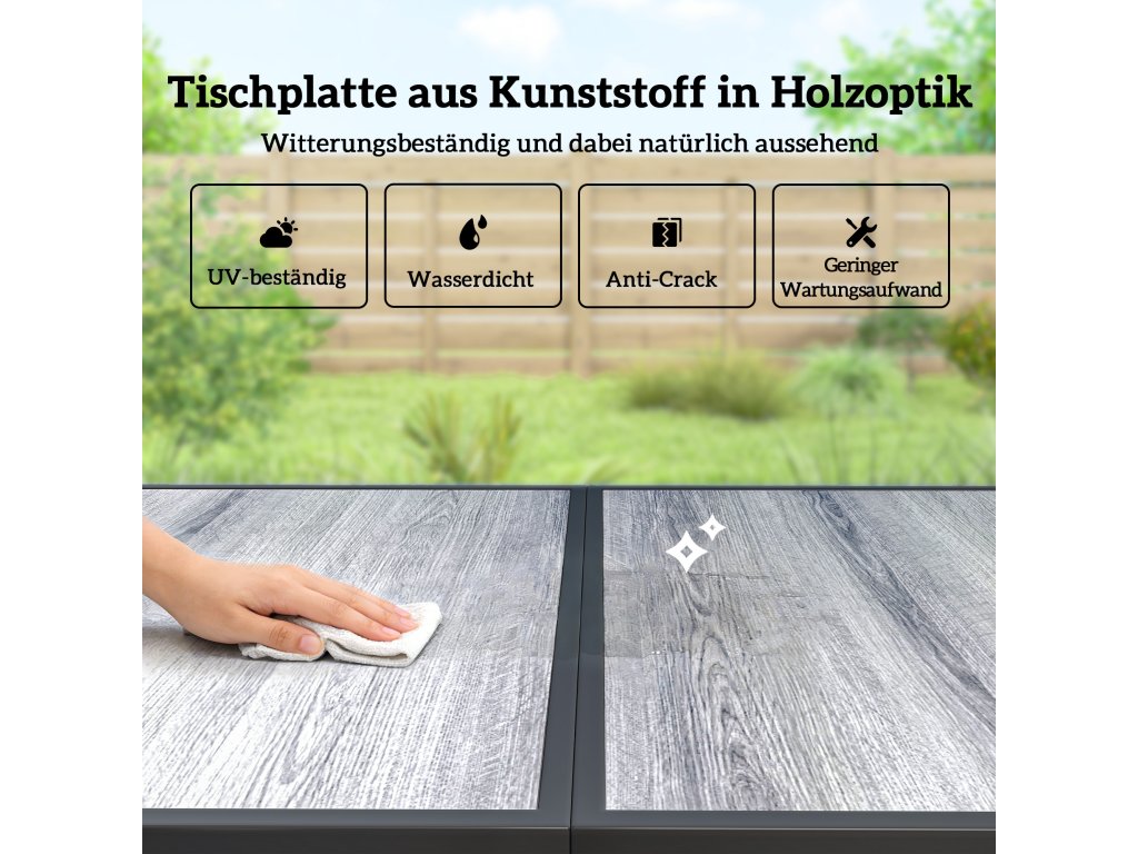 Deska z plastu s efektem dřeva: Dřevěný vzhled bez nutnosti údržby. Deska stolu z plastu PSPC je odolná vůči praskání, vyblednutí a vodě. Po jídle ji očistěte jednoduchým otřením – ideální pro bezstresové chvíle na zahradě.