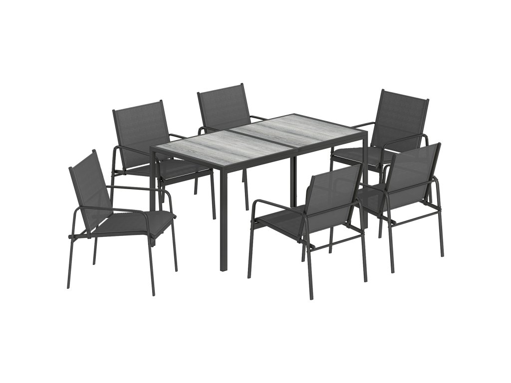 Zahradní nábytek Outsunny, sedací souprava 150 x 80 cm, stůl se 6 prodyšnými židlemi, imitace dřeva, ocelový rám, černá