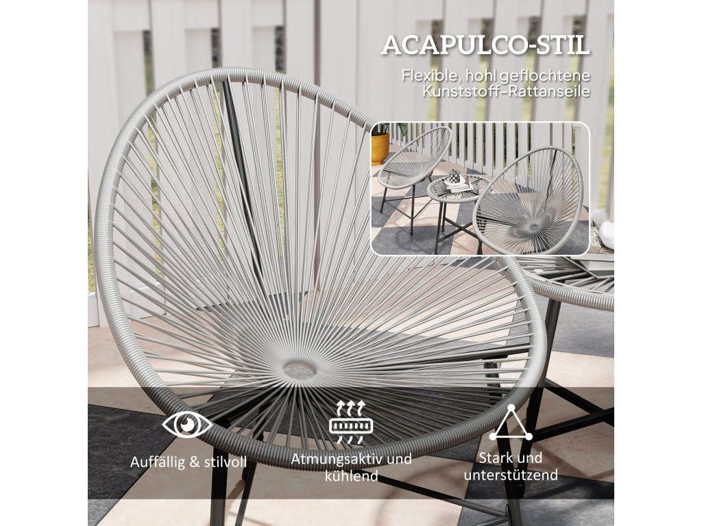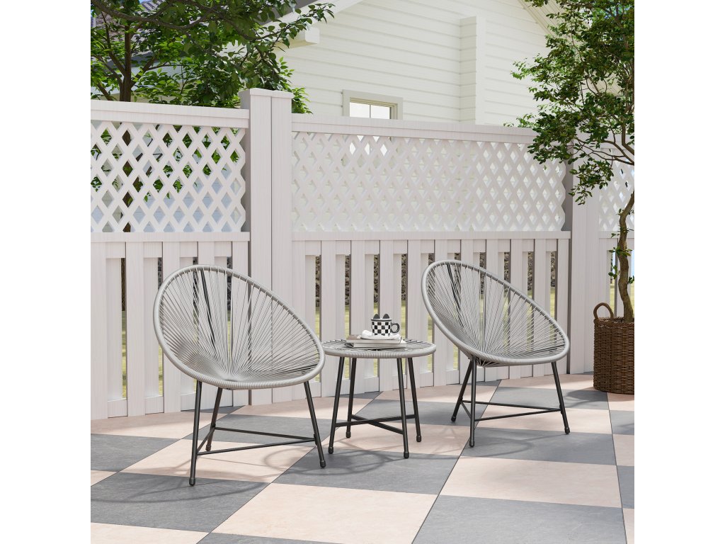 Relaxujte venku s touto elegantní sadou balkonového nábytku Outsunny, která obsahuje dvě oválné židle ve stylu Acapulco a odpovídající konferenční stolek. Pružná, dutě tkaná syntetická ratanová lana bistro sady poskytují příjemný a příjemný zážitek z posezení. Konferenční stolek z tvrzeného skla je stylový a snadno se čistí. Ocelové rámy a nastavitelné nožní polštáře zajišťují stabilitu a oporu. Užijte si pohodlí této stylové sady balkonového nábytku.