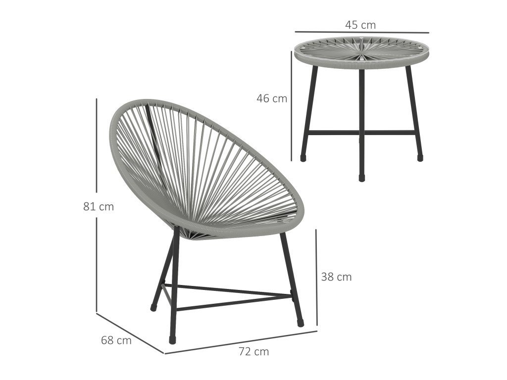 Rozměry balkonového nábytku: Židle: 72D x 68Š x 81V cm. Stůl: Ø45 x 46V cm. Maximální nosnost: Židle: 120 kg. Stůl: 30 kg. Nutná montáž.