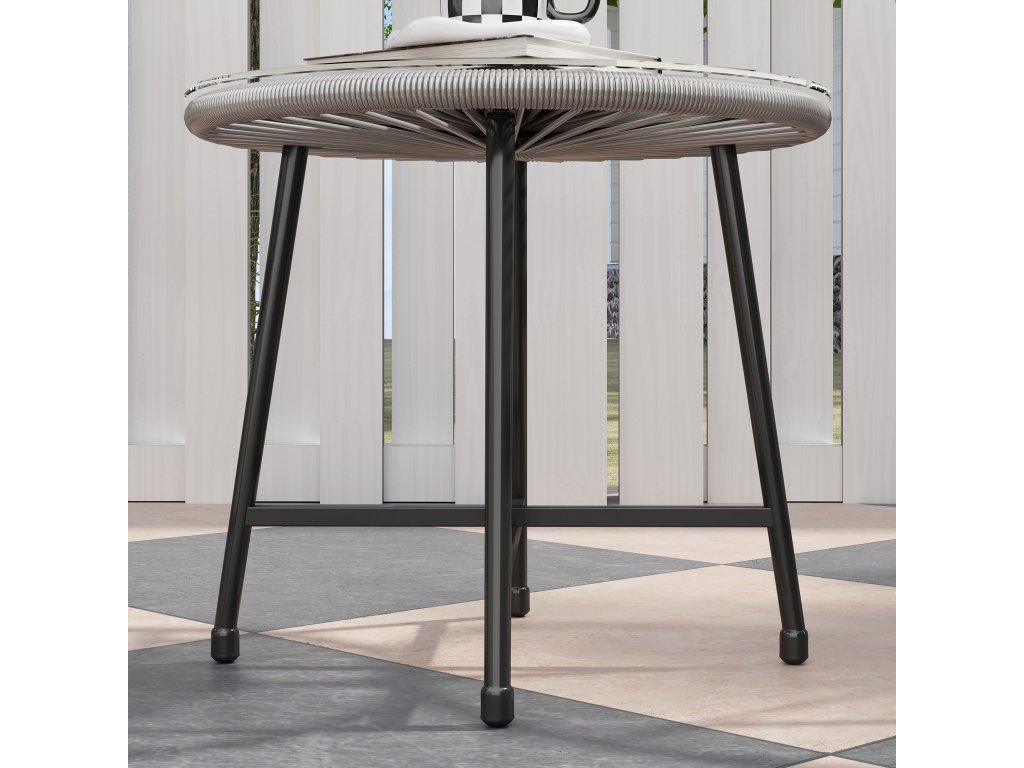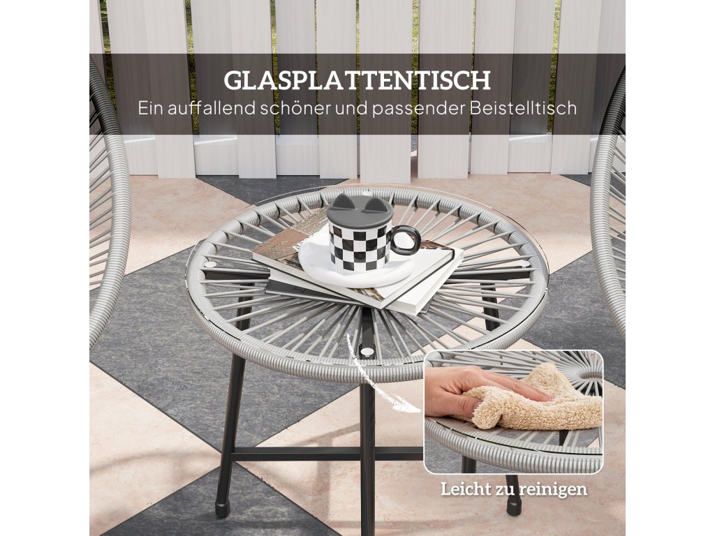 Stůl s deskou z tvrzeného skla: Výrazný a atraktivní prvek, který dokonale doplňuje židle balkonového nábytku. Ideální pro uložení nápojů, občerstvení nebo knih po ruce během relaxace. Snadno se čistí.