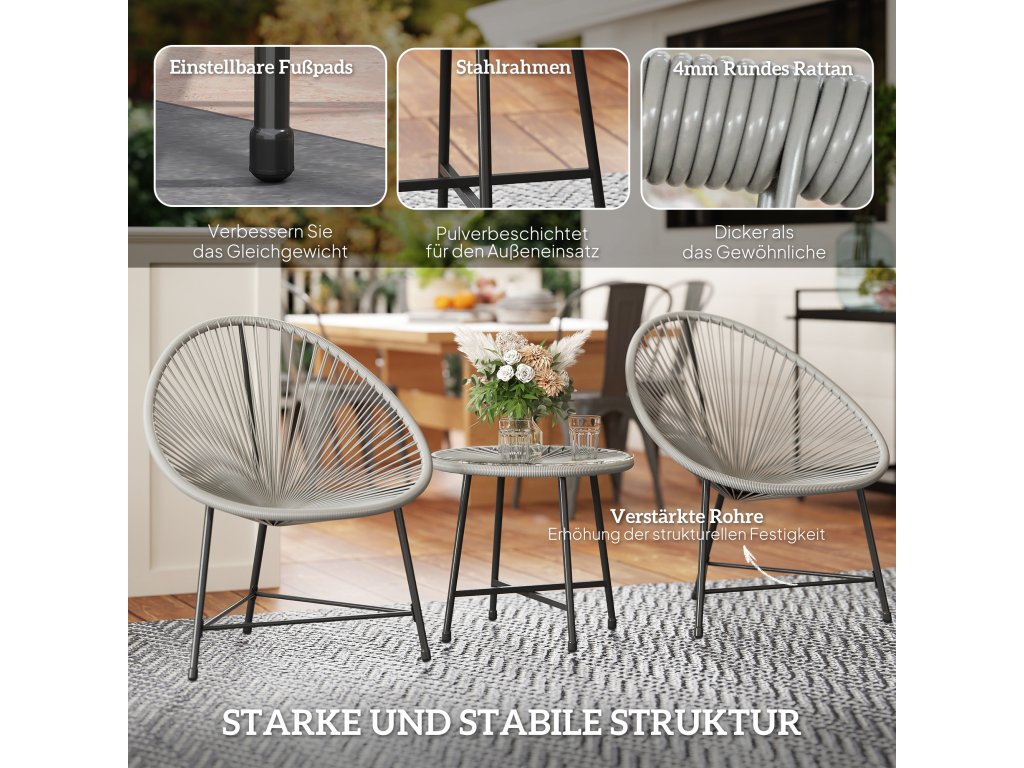 Ocelový rám: Práškově lakovaná ocel se zesílenou konstrukcí a syntetickým ratanem činí zahradní stůl a židle obzvláště robustními. Nastavitelné opěrky nohou na balkonovém nábytku poskytují dodatečnou stabilitu.